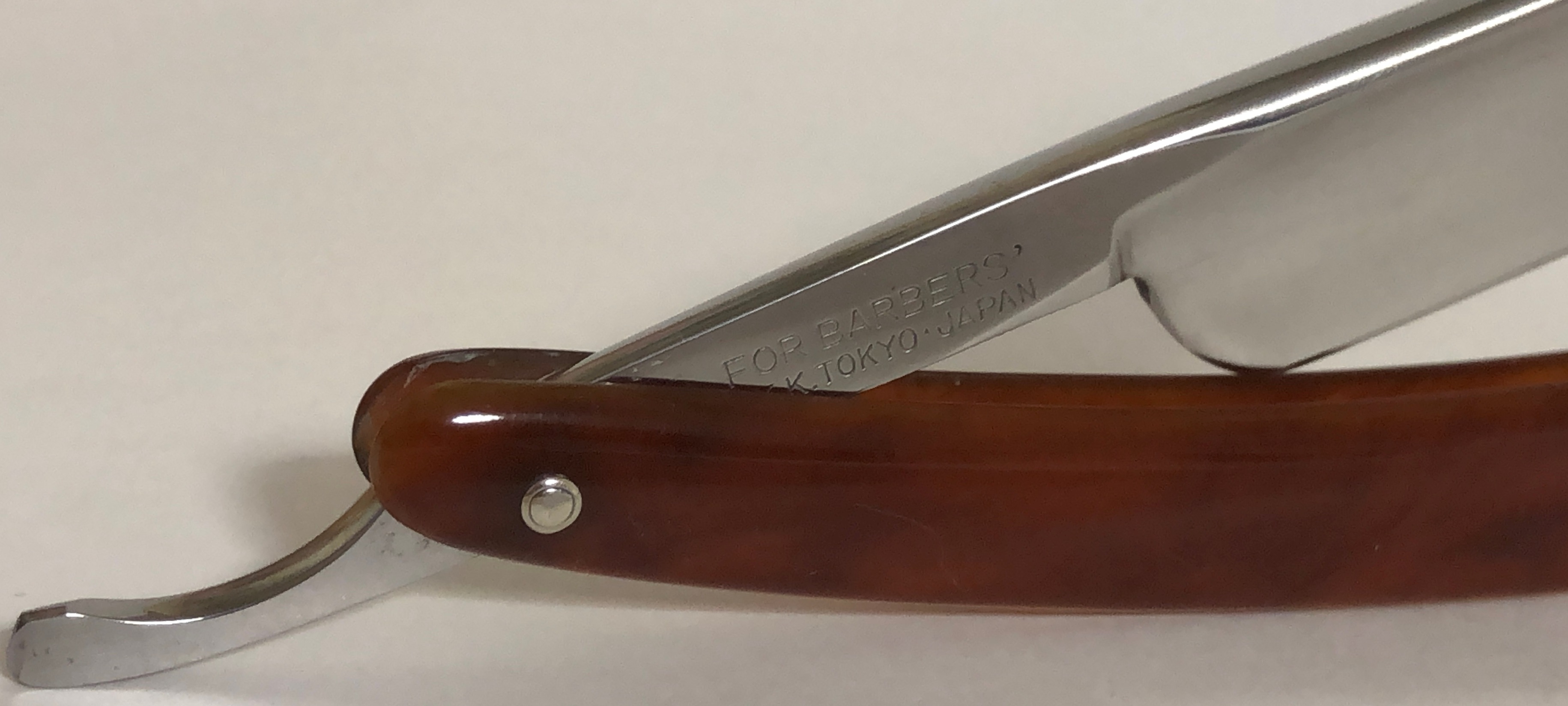 Бритва с немного неестественной формой лезвия именно для японцев."Горбатый"обушок , вкупе с тонким эрлем и средними размерами клинка смотрится очень даже неплохо.Бритву разобрал, почистил полотно и снова обрал, предварительно проклеив трещинку на ручке у нижнего пина.Сталь и кромка чистые от разного рода видимых дефектов.Идеальная геометрия клинка. Кромочка равномерна по всей длине.Удобная, вёрткая, с отличной сталью бюджетная бритва. Заточена и готова к бритью.