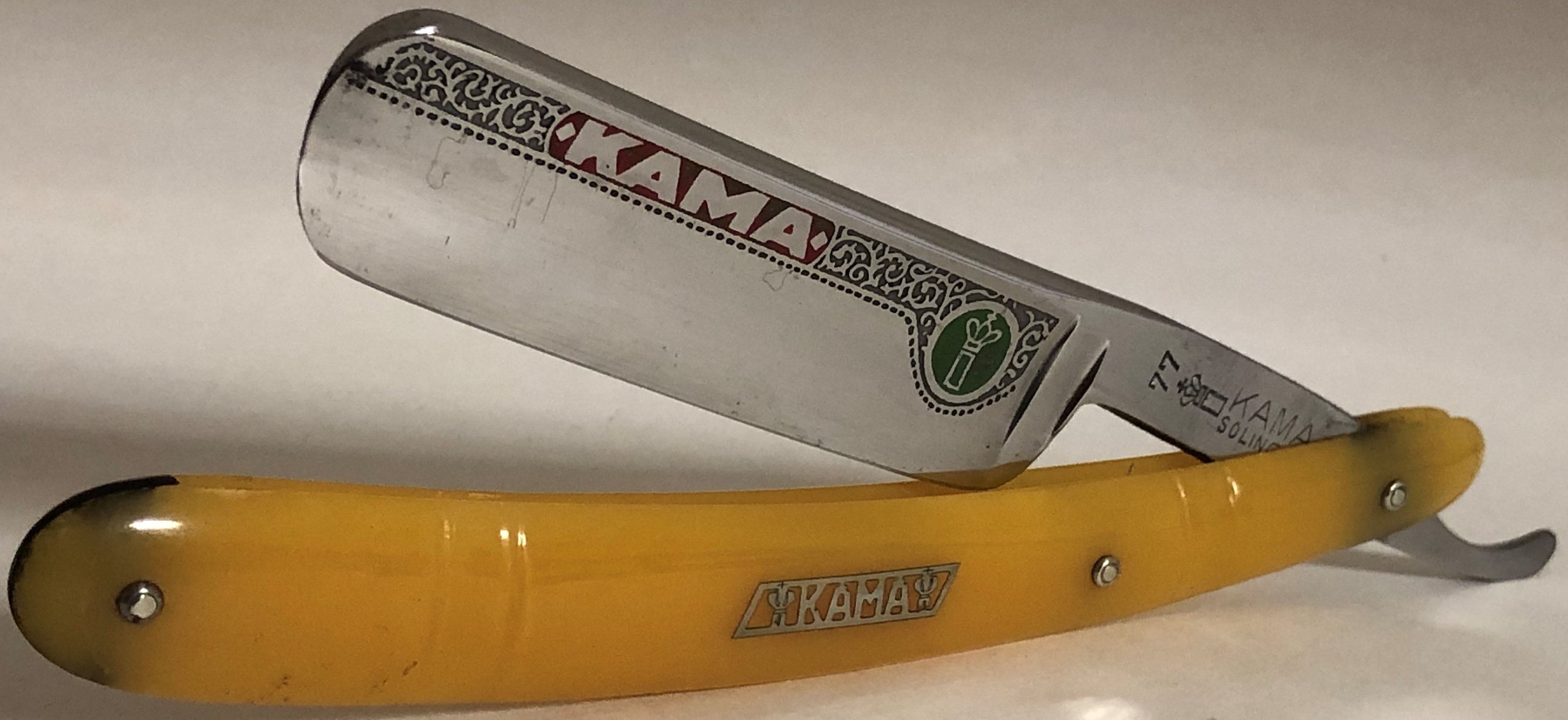 Клинок в пользовании не был.Единственно что,прошёлся тонким абразивом,дабы убрать немного окисления металла от времени.Попробовал воссоздать "родной"поперечный гринд.Идеальная геометрия полотна:кромочка равномерна по всей длине. Вместо сломанной оригинальной оправы поставил ручку от немецкого донора. Хорошая,добротная и ровная оправа.Небольшие трещинки намертво проклеены и никоим образом не повлияют на дальнейшую эксплуатацию.Немецкие двух-цветные пины, с добавлением внутренних шайб.Очень неплохой и недорогой рабочий инструмент, особенно для новичка.Заточена и готова к бритью.