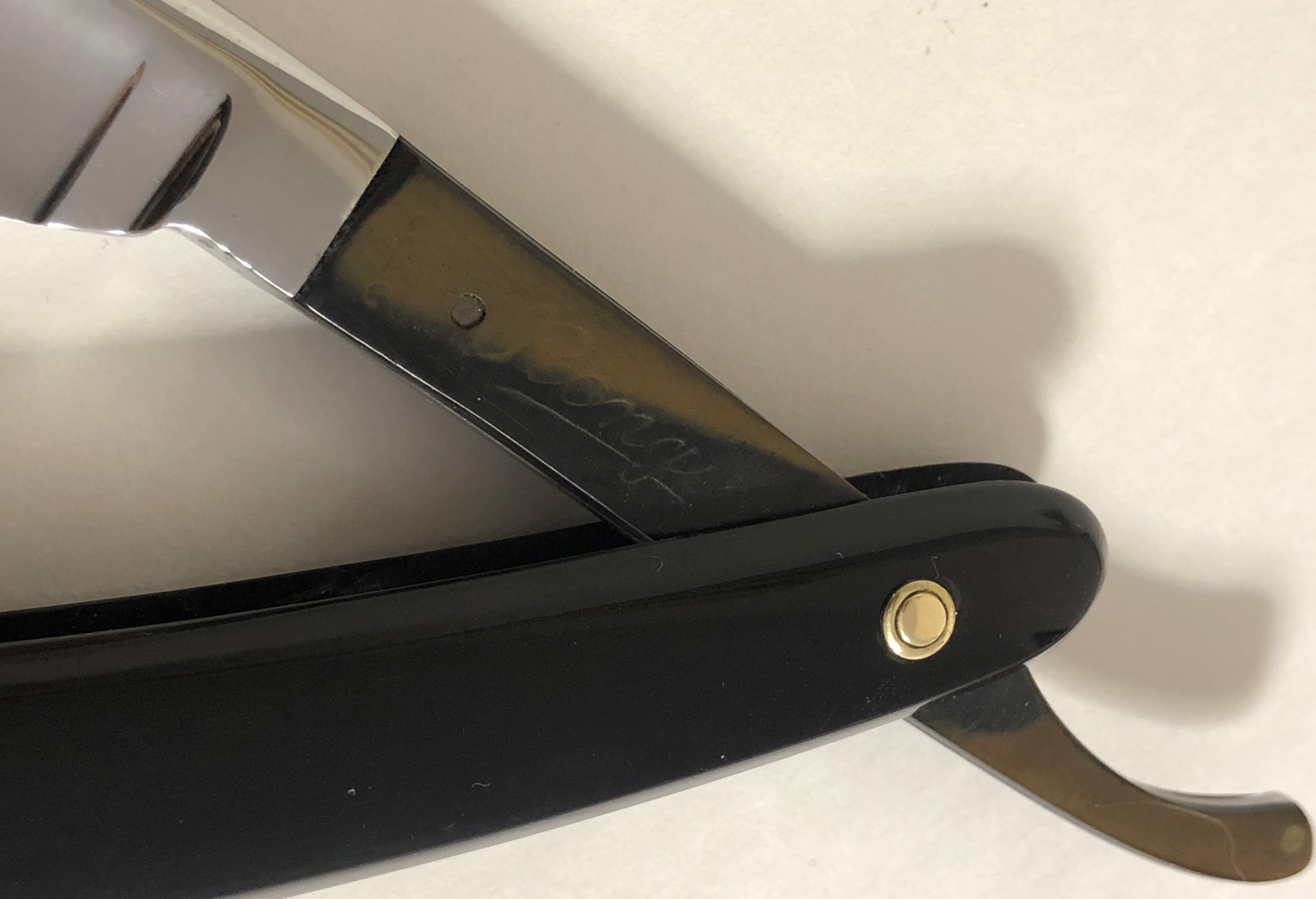 Клинок в пользовании не был.Единственно что,прошёлся тонким абразивом,дабы убрать немного окисления металла от времени.Попробовал воссоздать "родной"поперечный гринд.Идеальная геометрия полотна:кромочка равномерна по всей длине. Вместо сломанной оригинальной оправы поставил ручку от немецкого донора. Хорошая,добротная и ровная оправа.Небольшие трещинки намертво проклеены и никоим образом не повлияют на дальнейшую эксплуатацию.Немецкие двух-цветные пины, с добавлением внутренних шайб.Очень неплохой и недорогой рабочий инструмент, особенно для новичка.Заточена и готова к бритью.