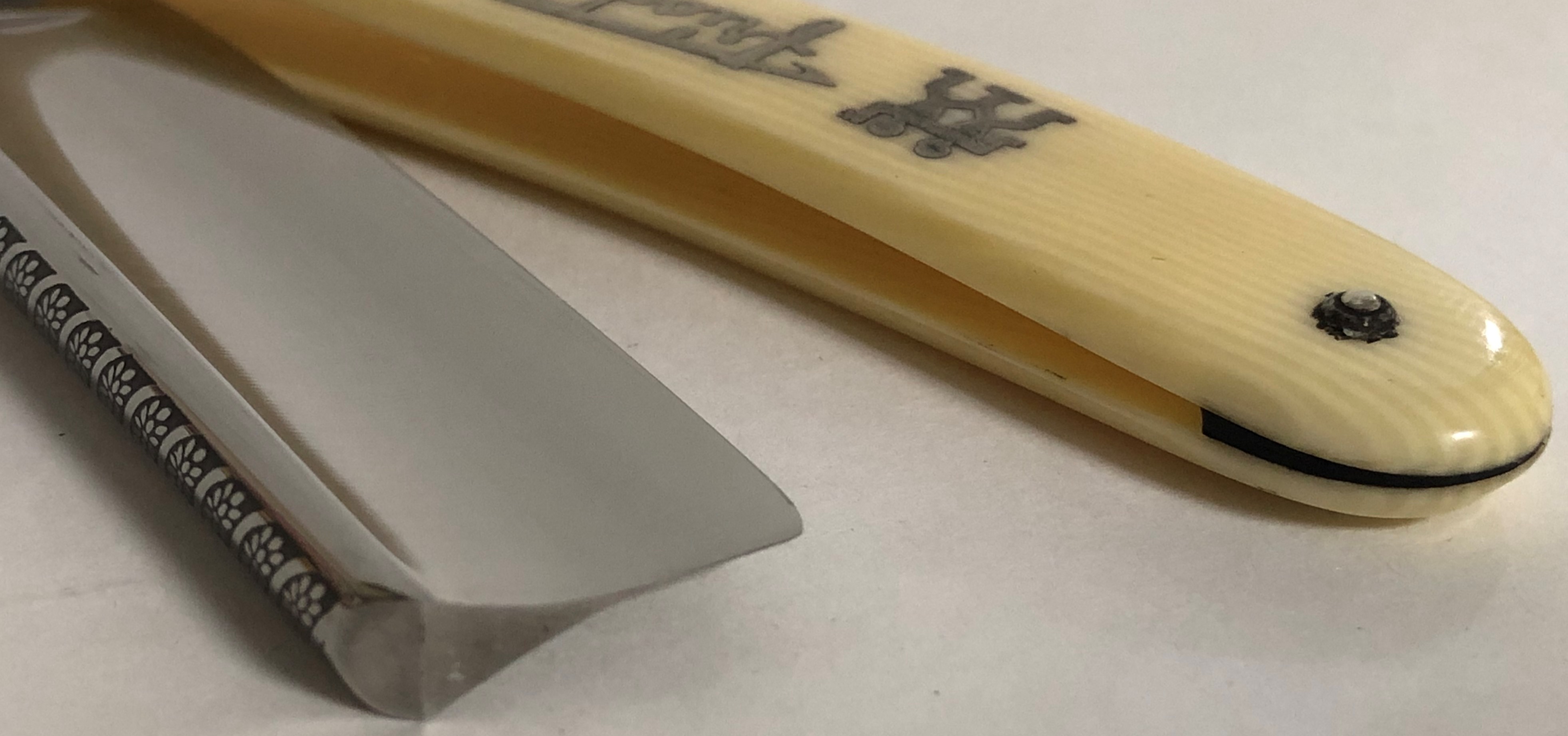 Бритва совершенно нетронута заточными камнями.Клинок в идеальном состоянии, без каких либо видимых дефектов.Немного неидеальна одна плашка ручки(от времени), но закрывается все по центру.Кромочка равномерна по всей длине.Эффектный ажурный обушок.Очень неплохое коллекционное состояние.Оригинальная коробочка будет немного позже.