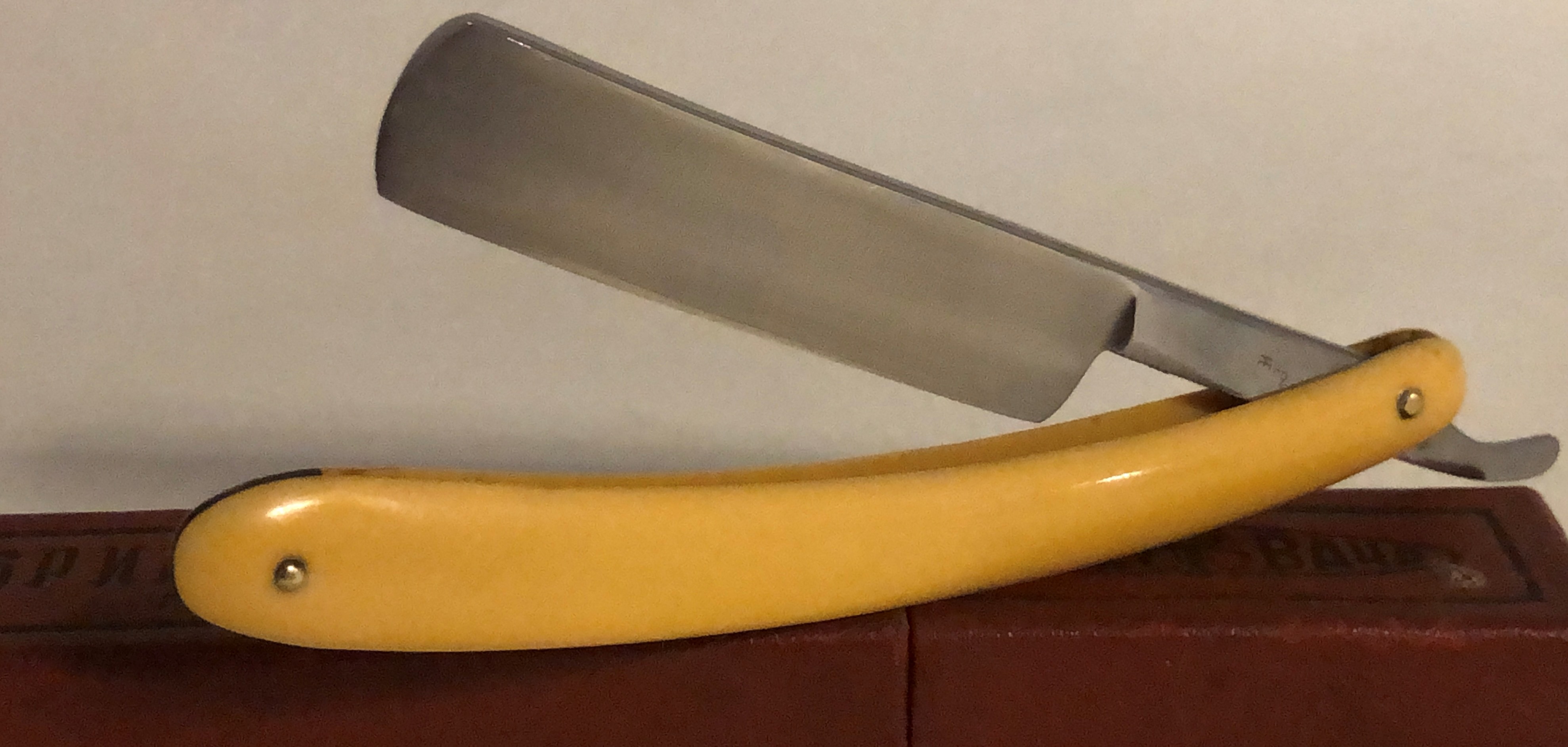 Бритва после реставрации. Было почищено и исправлено полотно, перебрана ручка,с сохранением оригинальных пинов. Клинок сейчас в хорошем состоянии, без видимых "следов времени".Кромочка равномерна по всей длине.За счет своего толстого обушка бритва тяжёлая.Достаточно приятная бритва,с качественной сталью. Не пропустите бюджетный вариант для новичка!!Заточена и готова к бритью.