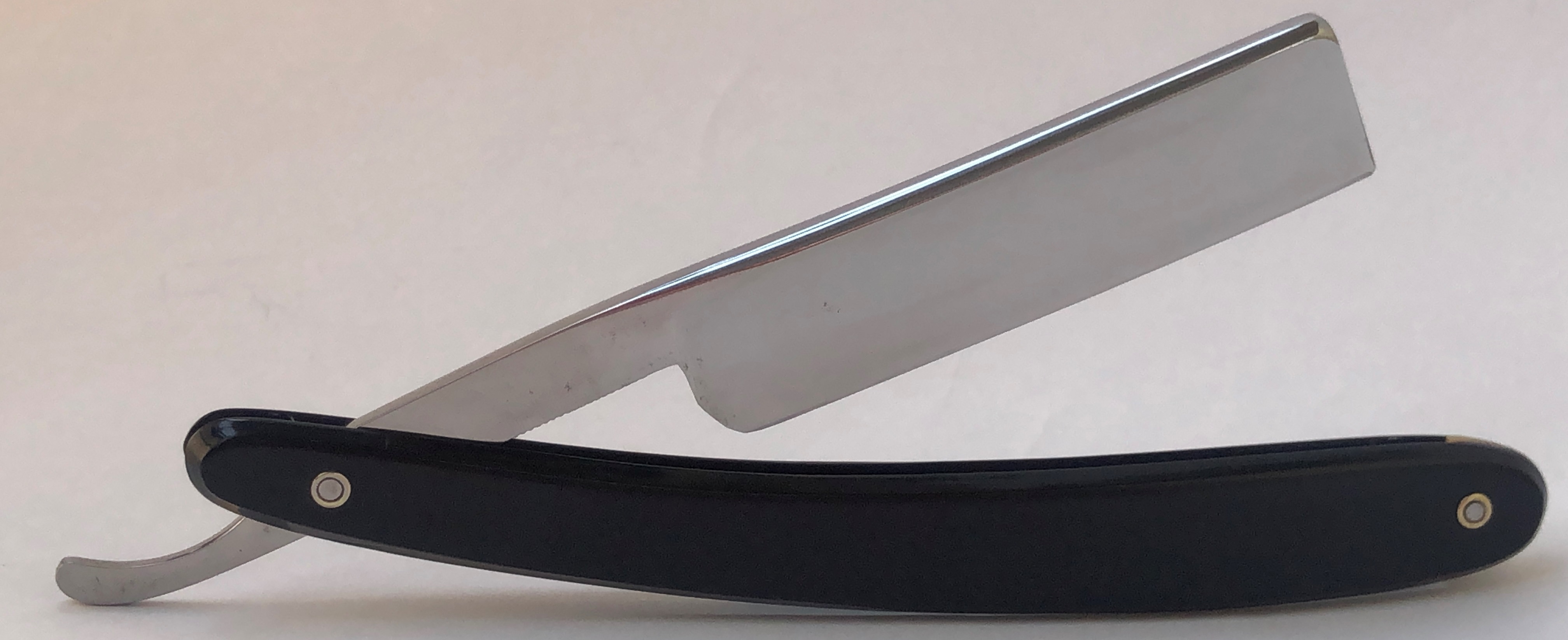 По всей видимости бритва была непользованная, но имела скол на 1.5 мм и немного очагов ржавчины, которые после определенных работ были успешно устранены.Разобрал, почистил, умеренно отполировал и заново собрал, заменив оригинальные пины на немецкие двух-цветные втулки.Идеальная геометрия:кромочка равномерна по всей длине.Бритва продается с 60%-ой скидкой, так что не пропустите..Заточена и готова к бритью.