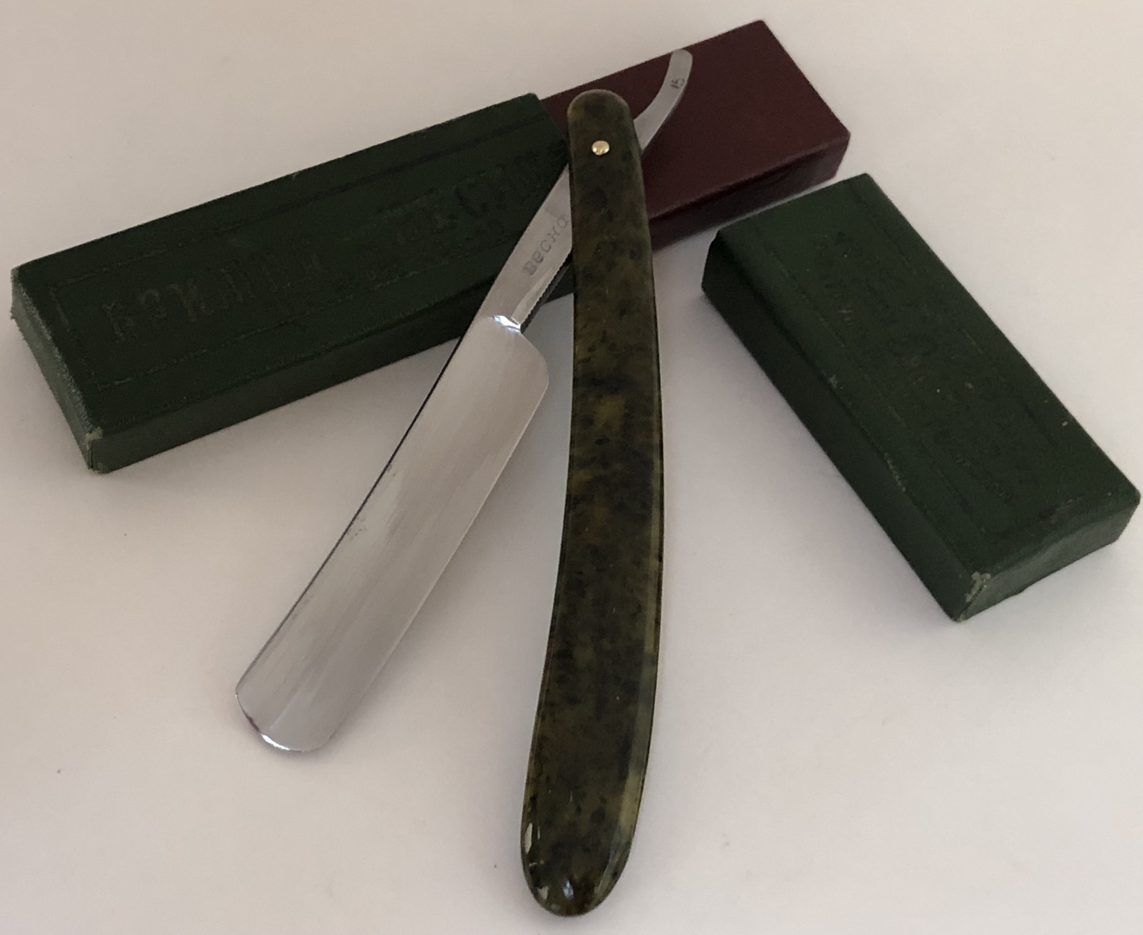 Изначально бритва не имела следов пользования. Разобрал, почистил немного полотно, с сохранением эффектной патины на эрле.Сталь клинка чистая, без видимых дефектов.Красивая оригинальная оправа,"под черепаху".Родная коробочка в комплекте! Бритва заточена и готова к бритью.