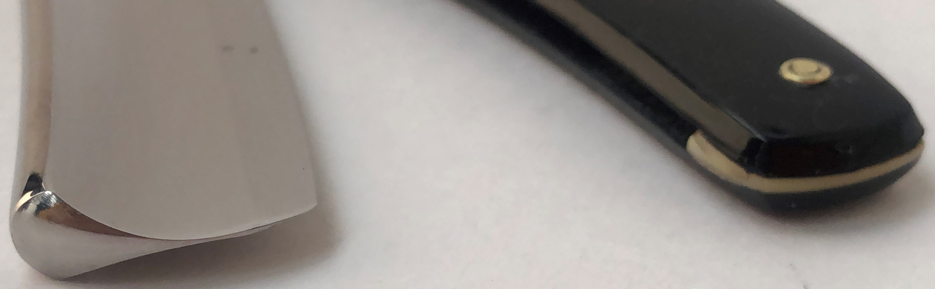 Бритва в состоянии приближенном к идеальному.Не разбиралась и не ремонтировалась. Единственно что, убрал на самых тонких абразивах пятна от остатков воды на клинке.Сформировал "типа-оригинальный" гринд полотна и умеренно отполировал.Сталь чистая от дефектов.Кромочка почти идеально ровная по всей длине. Родная коробочка в хорошем состоянии.