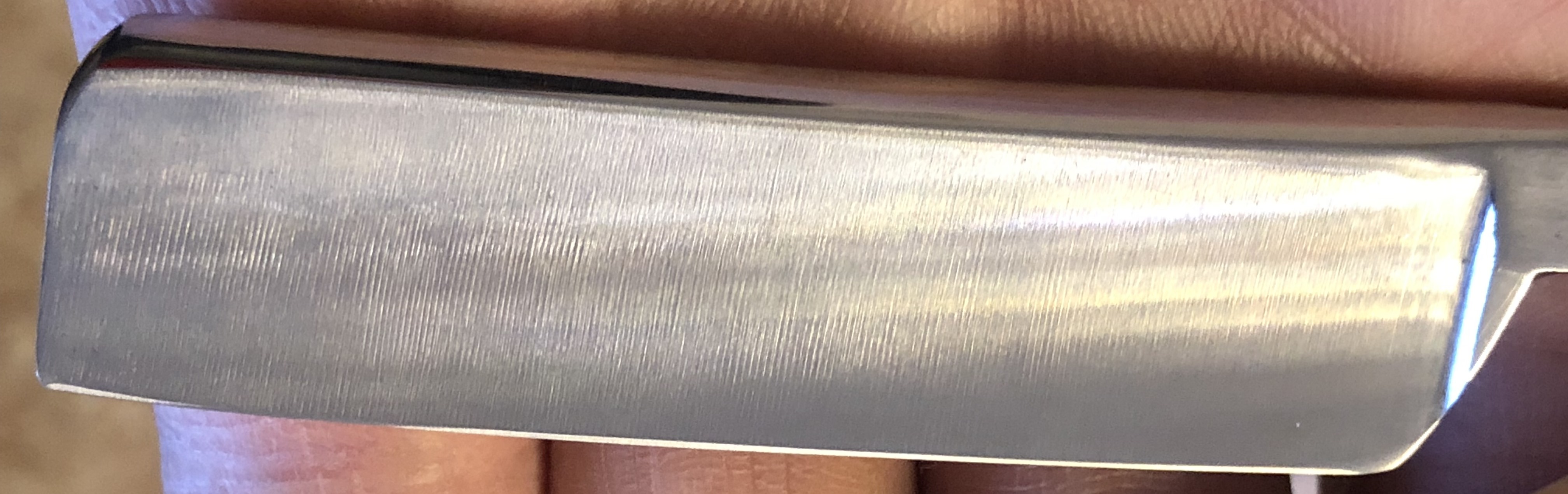 Сама пластина лезвия была вручную продольно отшлифована до 800 грит, на камнях.Остальное"тело" бритвы было доведено практически до "зеркала". Такая комбинированная шлифовка, как и должна была выглядеть бритва изначально.Идеальная геометрия полотна. Кромочка равномерна по всей длине и еле заметна.За счет толстого обушка и мощной оправы бритва тяжёлая, что очень хорошо при контроле самого процесса бритья, чувствуется в руке и не даёт возможность часто резаться.Сталь и кромка чистые, без видимых дефектов.