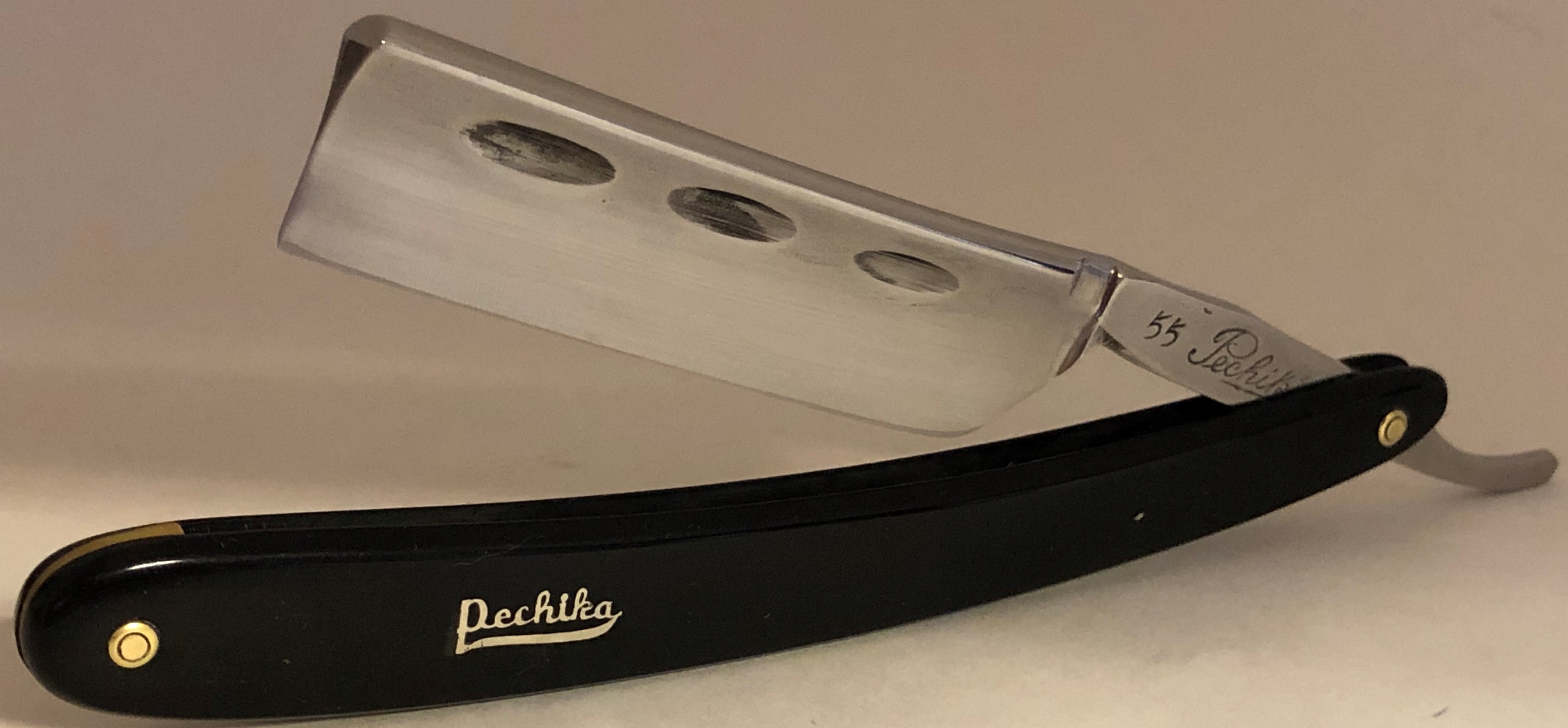 Бритва была разобрана, клинок перешлифован и умеренно отполирован.Заводские пины были сохранены и заново установлены.Очень неплохая геометрия полотна.Кромочка тоненькая по всей длине полотна. Оригинальная оправа также в очень хорошем состоянии. Бритва перед отправкой будет до конца заточена и доведена до комфортного бритья.