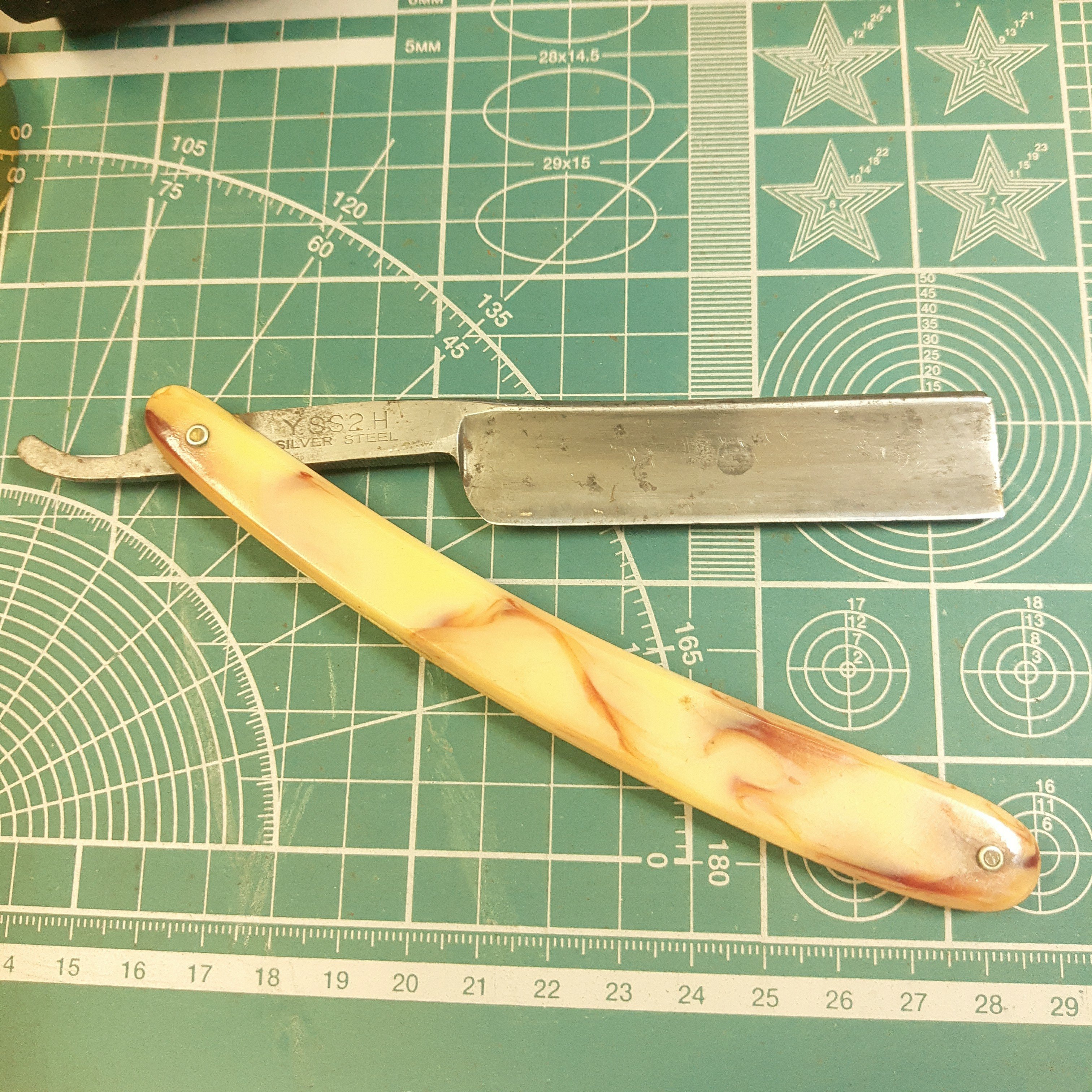 Бритва скроее 50-60++, и довольно неприятный для заточки заков. Сама бритва сгнила и ценности не представляет. Заклёпки - гвоздики, ударил по гвоздику и с той и с той стороны уже 20й