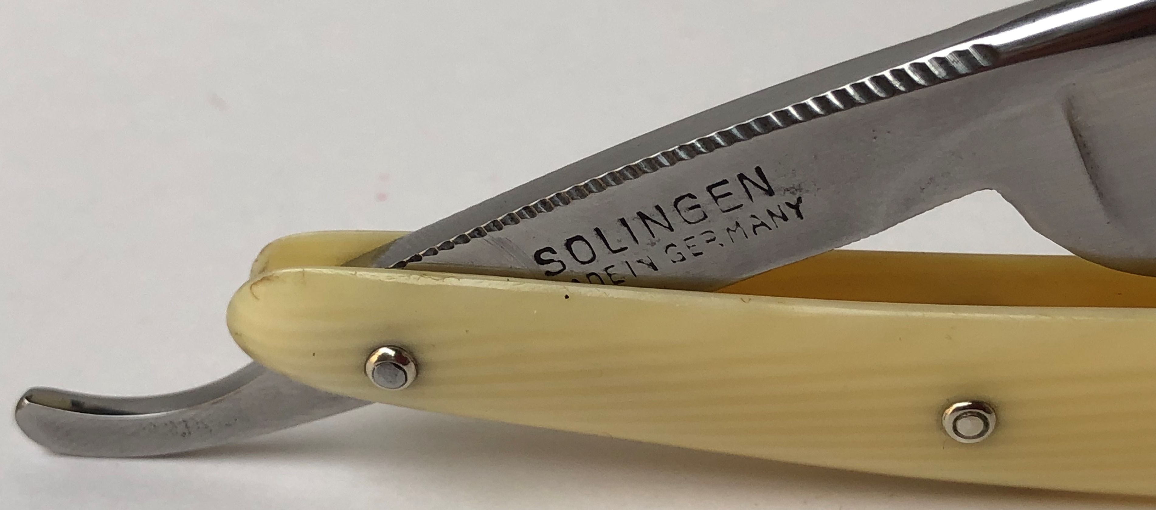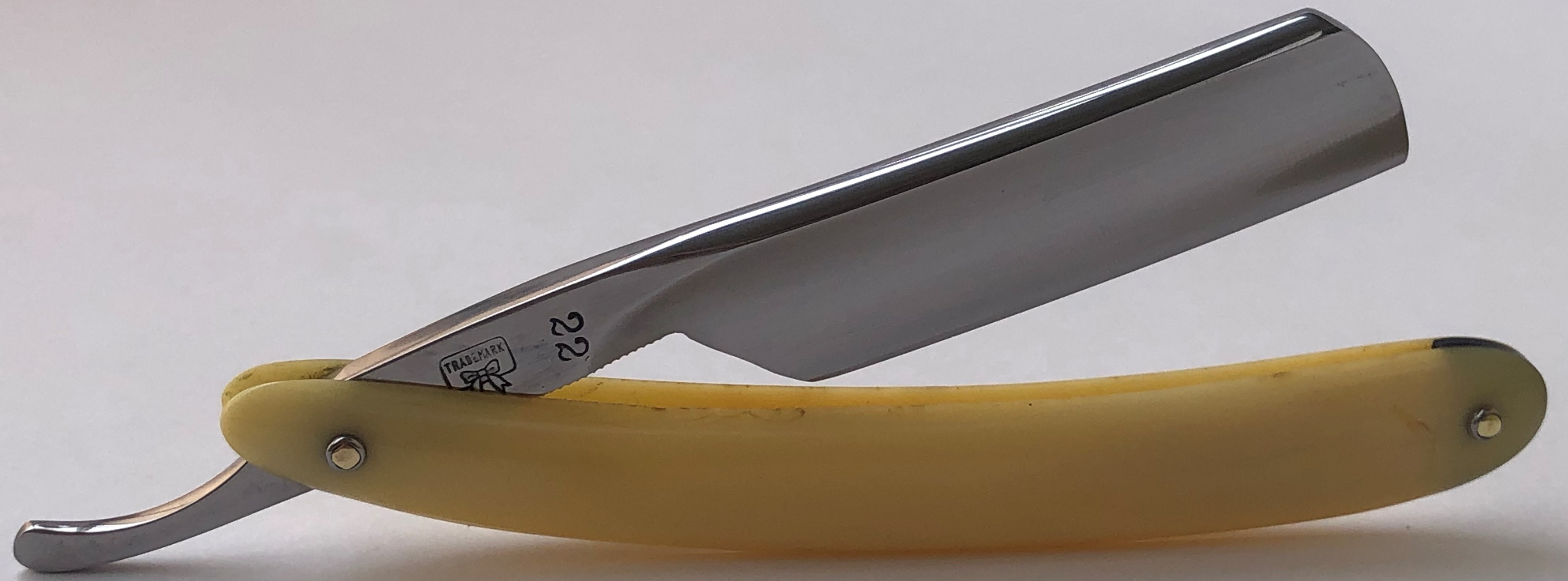 Бритва без следов пользования. Бритва была разобрана, немного освежено полотно от патины и снова собрано, с сохранением оригинальных пинов.Идеальная геометрия клинка:кромочка равномерна по всей длине.Сталь и кромка чистые от видимых дефектов.Бритва тяжёлая, мощная.Состояние новой.