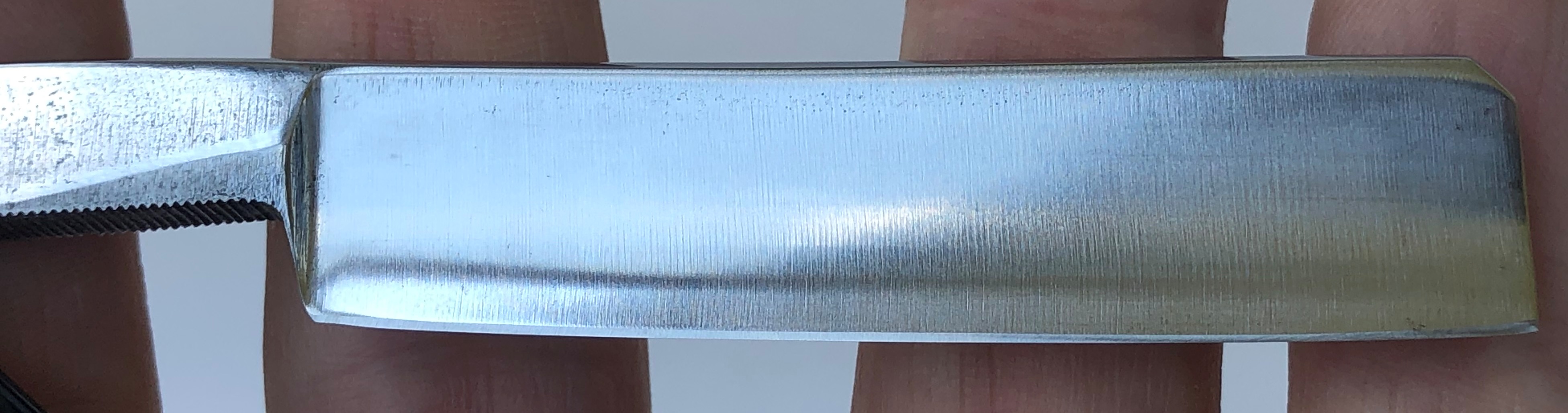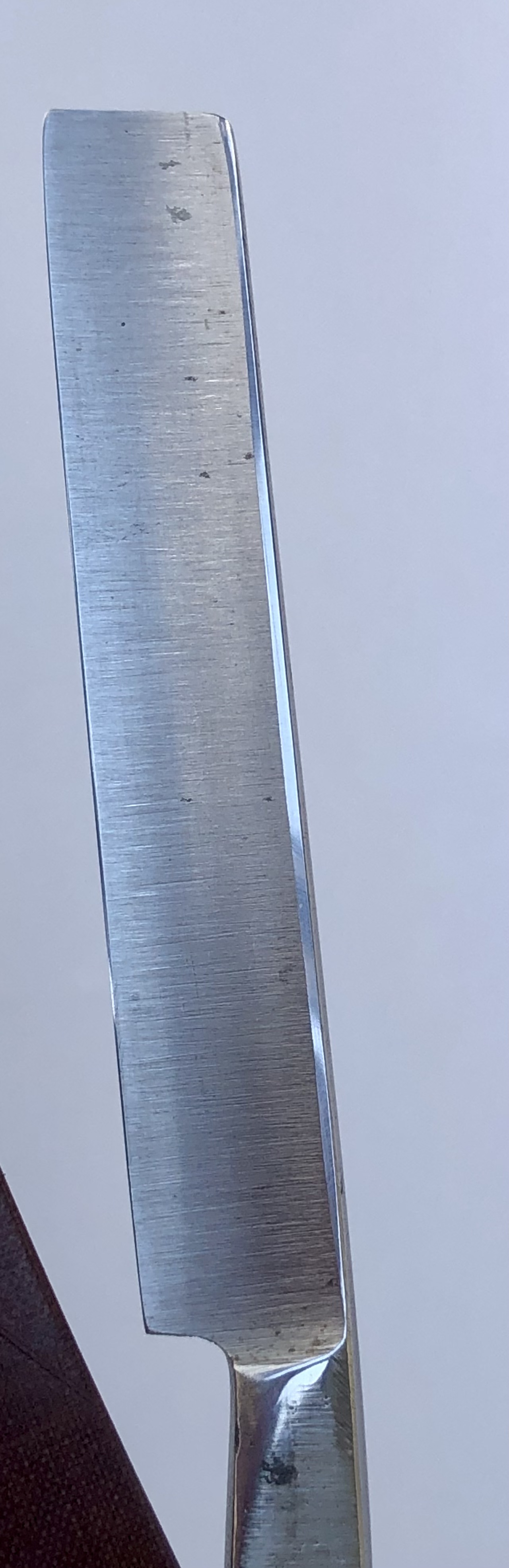 Само полотно на несколько мм укорочено.Было немного освежено от патины, с повторением "родного" характера шлифовки и умеренной полировки.Идеальная геометрия клинка. Сталь чистая, без видимых дефектов.Очень приятная во всех отношениях бритва, достаточно недорогая и если бы не укороченное полотно, то цены бы ей не было...
