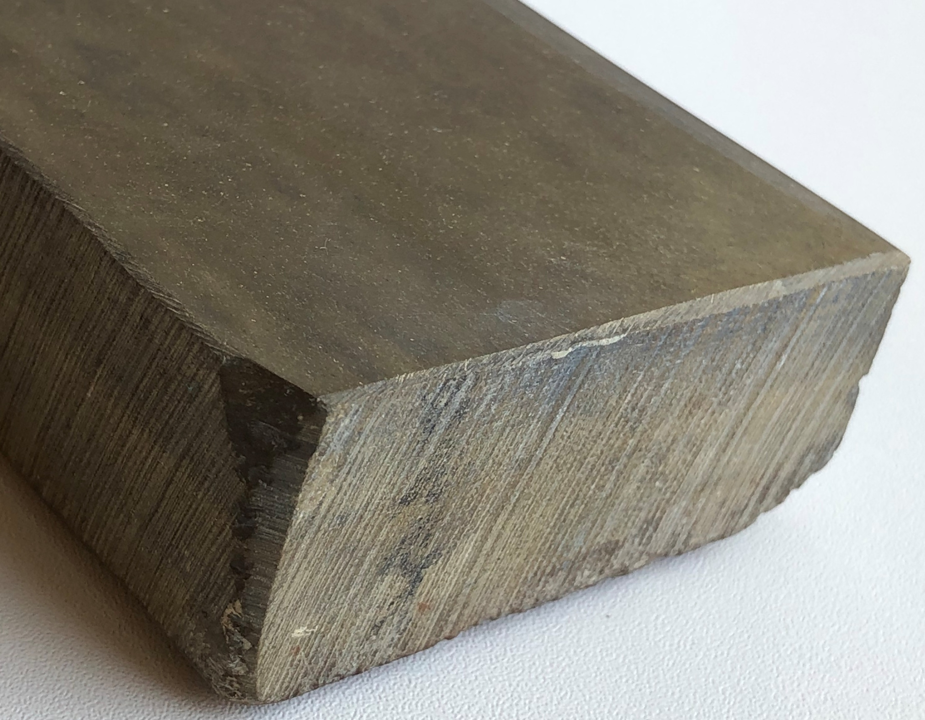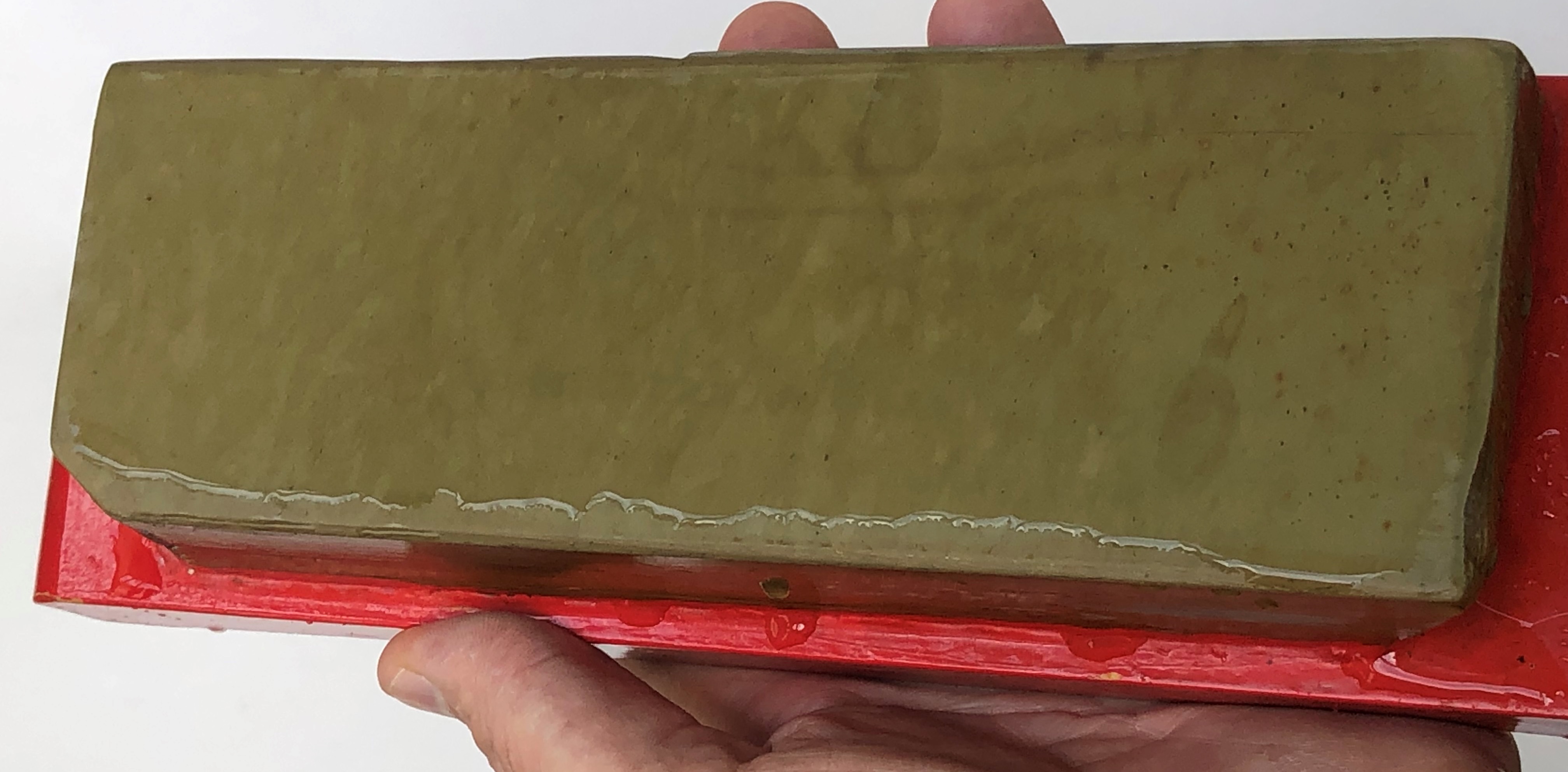 Камень твердый, для финишной тонкой доводки бритв( в приоритете), ножей и другого РИ.Глубокий зеленовато-жёлто-болотный оттенок.  Имеет заводской,японский характер торцевого распила.Прекрасно работает с нагурами. Практически не выделяет собственной суспензии, но не такой "стеклянный" тактильно, как на очень твердых камнях.Рабочая сторона притерта. Не имеет посторонних включений, "волосяных" линий, трещин, прожилок или других дефектов.Убодный в работе, с правильной формой камень.Тяжелый и толстый, так что хватит надолго.