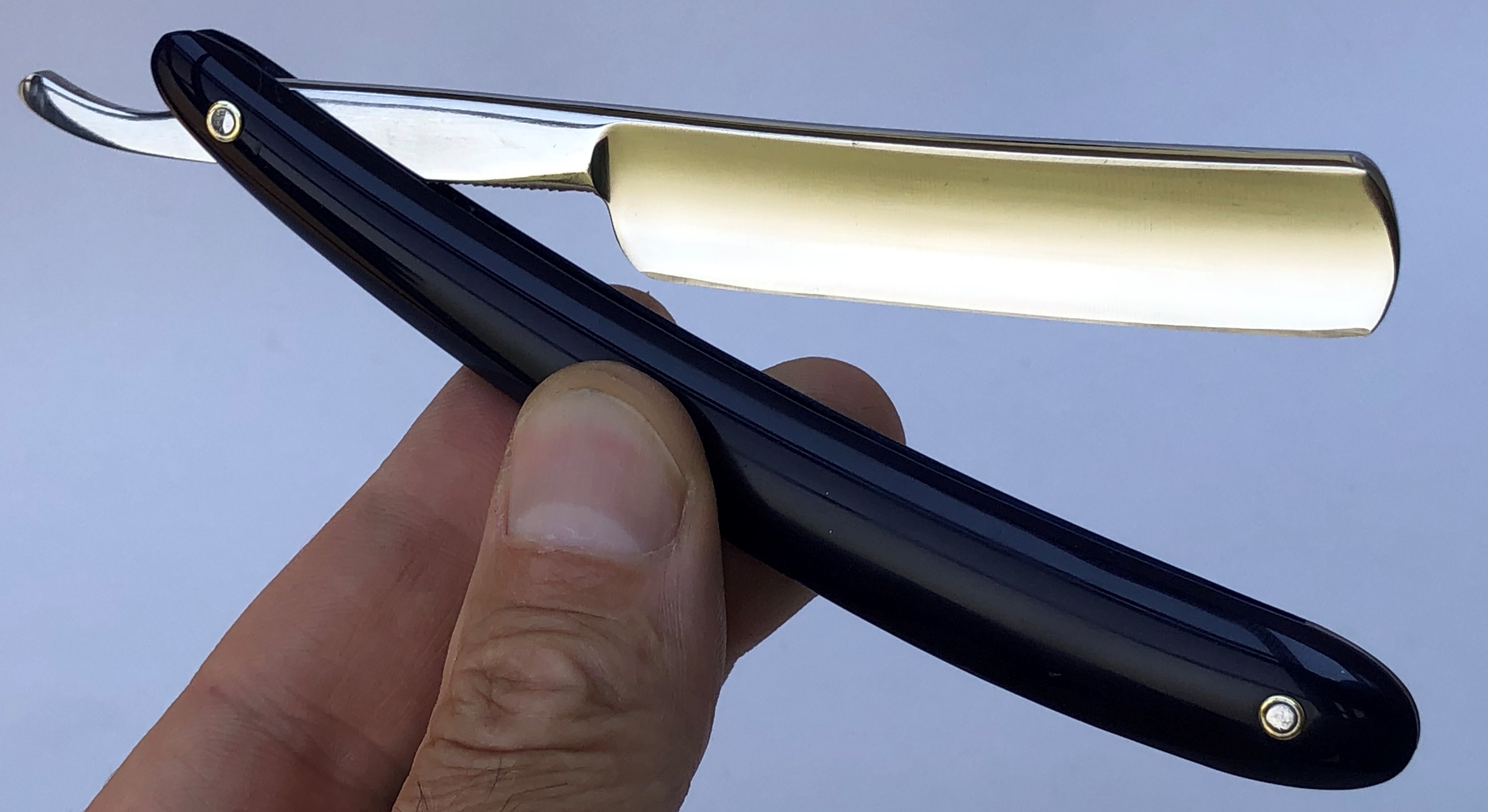 Очень красивая,удобная , в идеальном состоянии бритва. Ничего не разбиралось и не ремонтировалось.Следов пользования не заметил.Идеальная геометрия клинка:кромочка равномерна по всей длине.Сталь чистая, без видимых дефектов.Эффектные пластиковые накладки предотвращают и защищают металл в районе осевого пина от коррозии и окисления.Прекрасная углеродистая сталь, способная к качественной доводке кромки бритвы и в итоге выдавать мягкое и чистое бритьё. Бритва заточена и готова к бритью. Кожаный чехол ручной работы в комплекте. Бритва на все случаи жизни.Идеально подойдет как для новичка, так и для подарка ,либо для себя любимого.