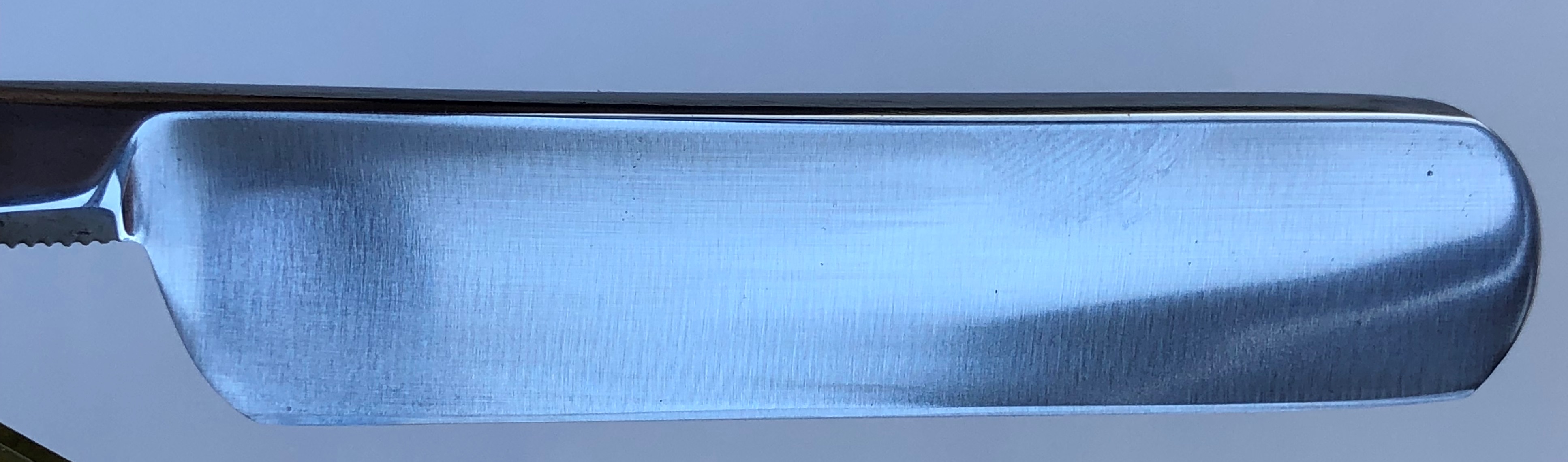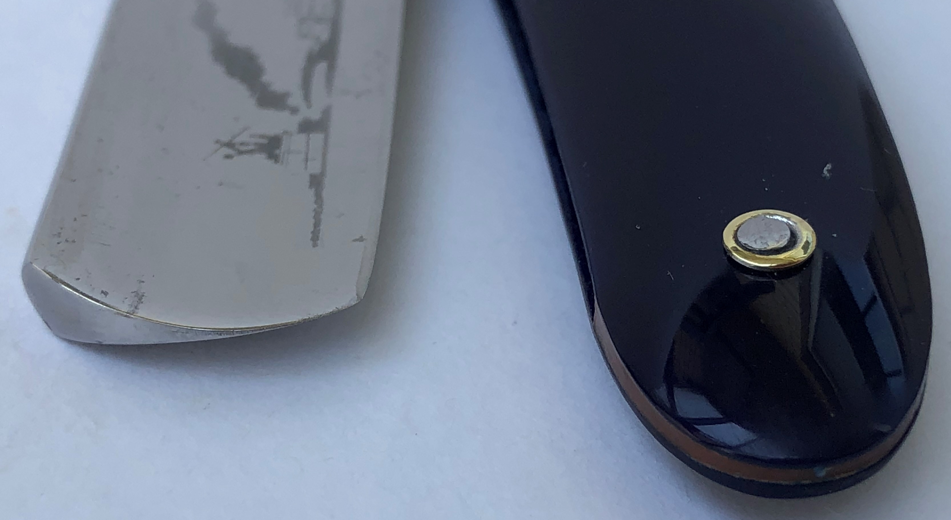 С большой долей вероятности могу сказать, что бритва именно советская и не рукодельная, а именно изготовлена на производстве.Забыл сделать фото оригинальных пинов, но те пины что стояли до косметических работ были именно как на Вачах и Стизах до и после военного периода. Т.е. медные расклепанные штифты, без шайб.По крайней мере я не помню, чтобы на импортных бритвах кто то и когда то ставил такие штифты, а не пины.Оправа напоминает Вачские и Стизовские бритвы 40-х годов, а сама форма клинка, с такой парикмахерской выемкой, очень похожа на стизовский "Спорт", а "горбатый" обушок на "Спартак".С другой стороны я специально сделал фото насечек на клинке, где они выполнены не так четко, как на заводских советских бритвах.За 10 лет мне попадалось несколько безымянных советских бритв, произведенных вот так качественно , а никак не кустарно.Сужу с точки зрения заточника, что качество стали ничем не отличается от качества советских бритв 40-х годов.Такая же плотная, тяжёлая и не сухая в заточке углеродка. Идеальная геометрия клинка:кромочка равномерна по всей длине.