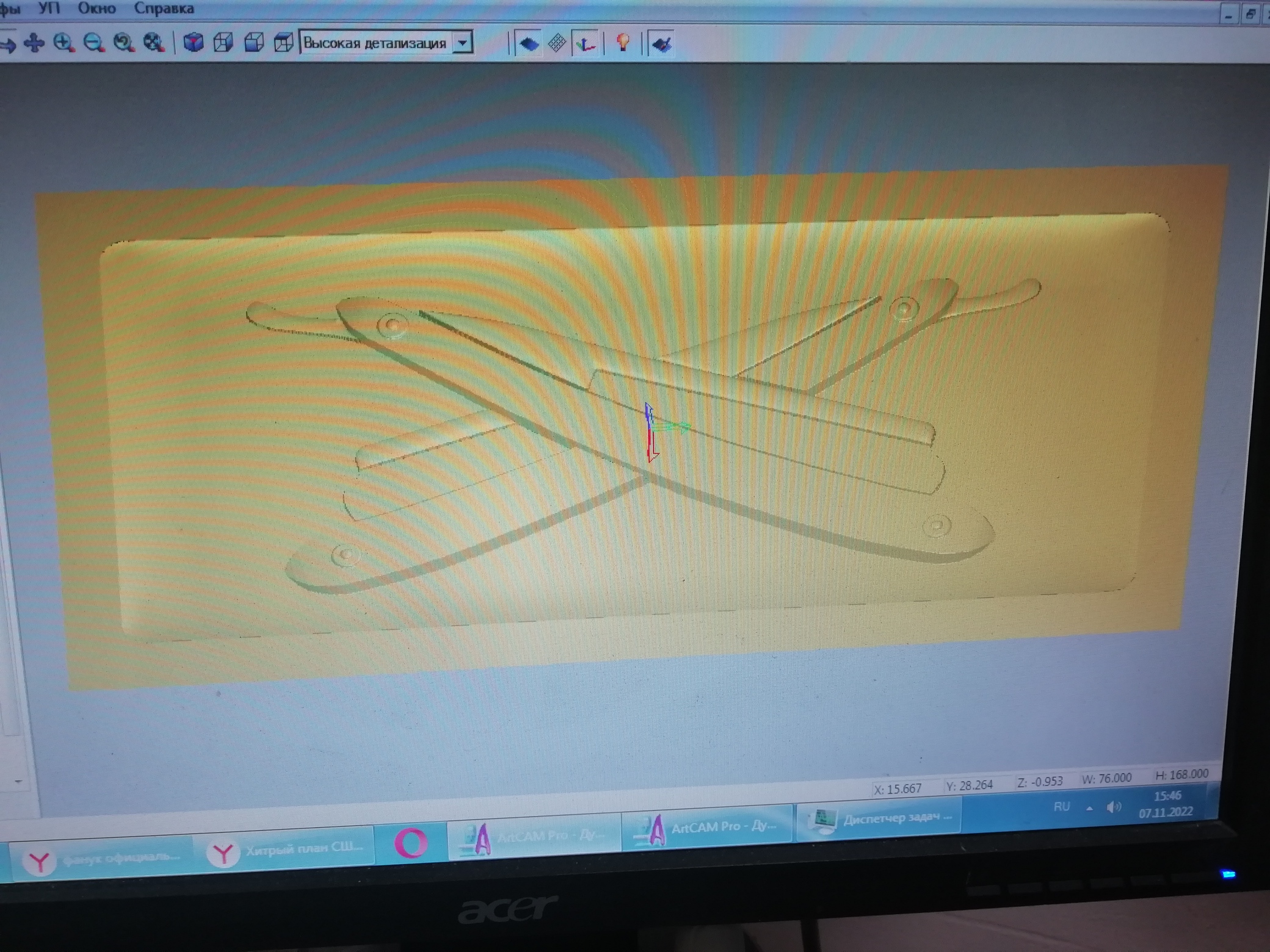 Сначала картинки проги (желтый цвет), затем привязка различных фрез (белый цвет) и само изделие:
