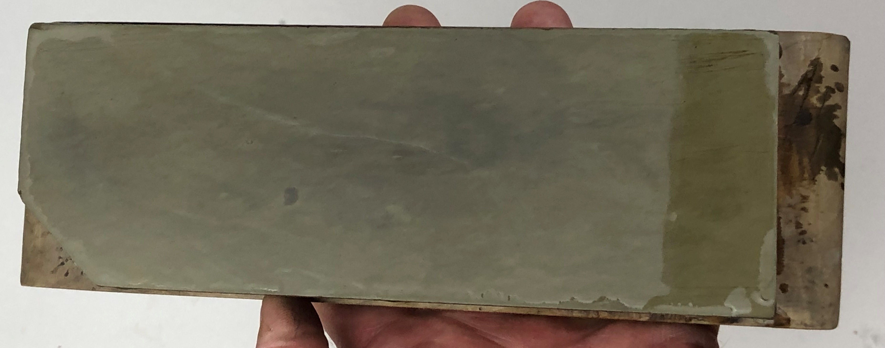 Прекрасный тонкий бритвенный финишник, из старой японский парикмахерской.Рабочая поверхность притерта, без трещин, прожилок и других дефектов.Отлично работает с нагурами.Своей суспензии практически не выдает. Ход бархатный и не такой стеклянный, как на очень твердых камнях.