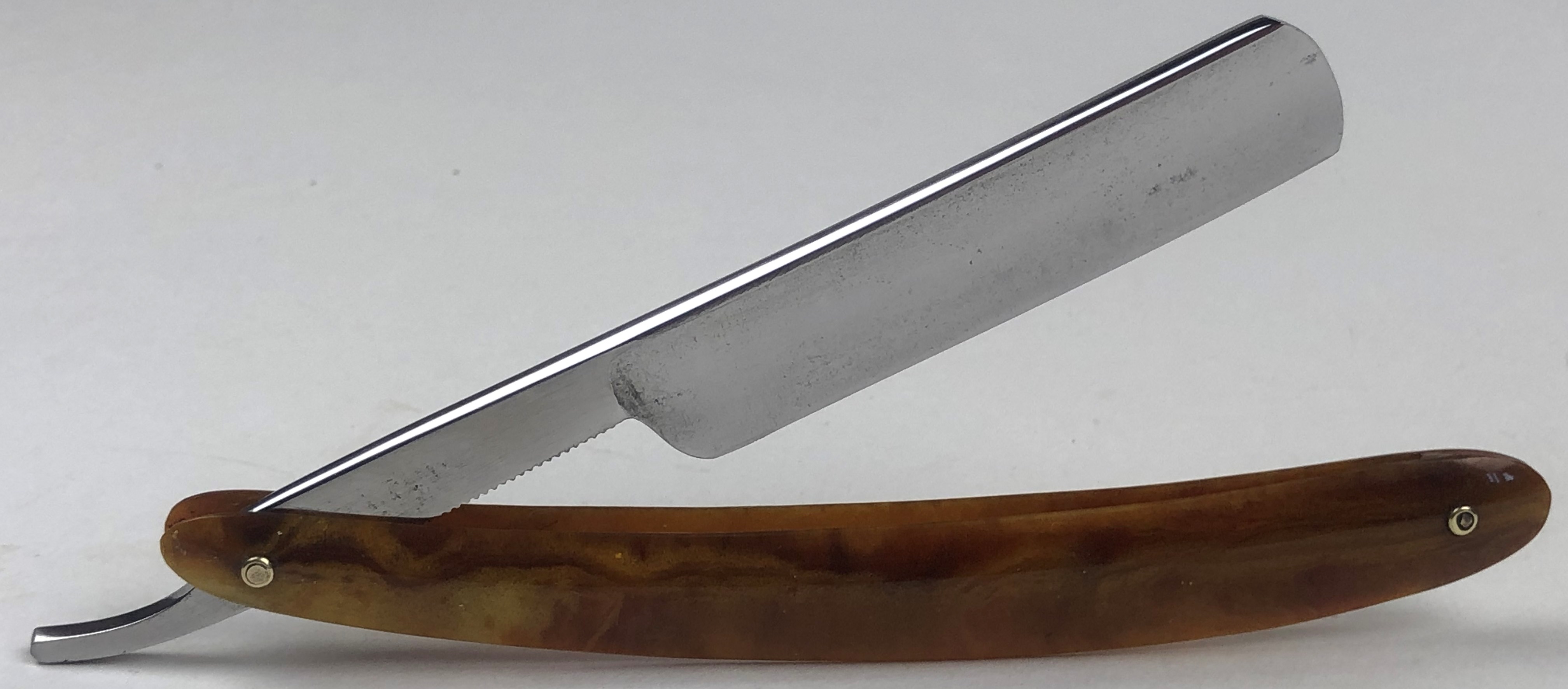 Ширина полотна-23 мм или 7/8. Толщина обушка-6.5 мм. Длина РК-50 мм. Полная вогнутость. Углеродистая сталь. Примерно 50-60-е годы прошлого века. Бритва в прекрасном непользованном состоянии. Заводская шлифовка и полировка полотна.Была разобрана, чтобы немного почистить район осевого пина и добавить внутренние шайбы. Фирменная "ступенька" полотна также присутствует. Идеальная геометрия клинка:кромочка равномерна по всей длине. Прекрасный и достаточно редкий экземпляр с таком состоянии. Заточена и готова к бритью. Цена-20500 р с доставкой.ПРОДАН Spoiler Show