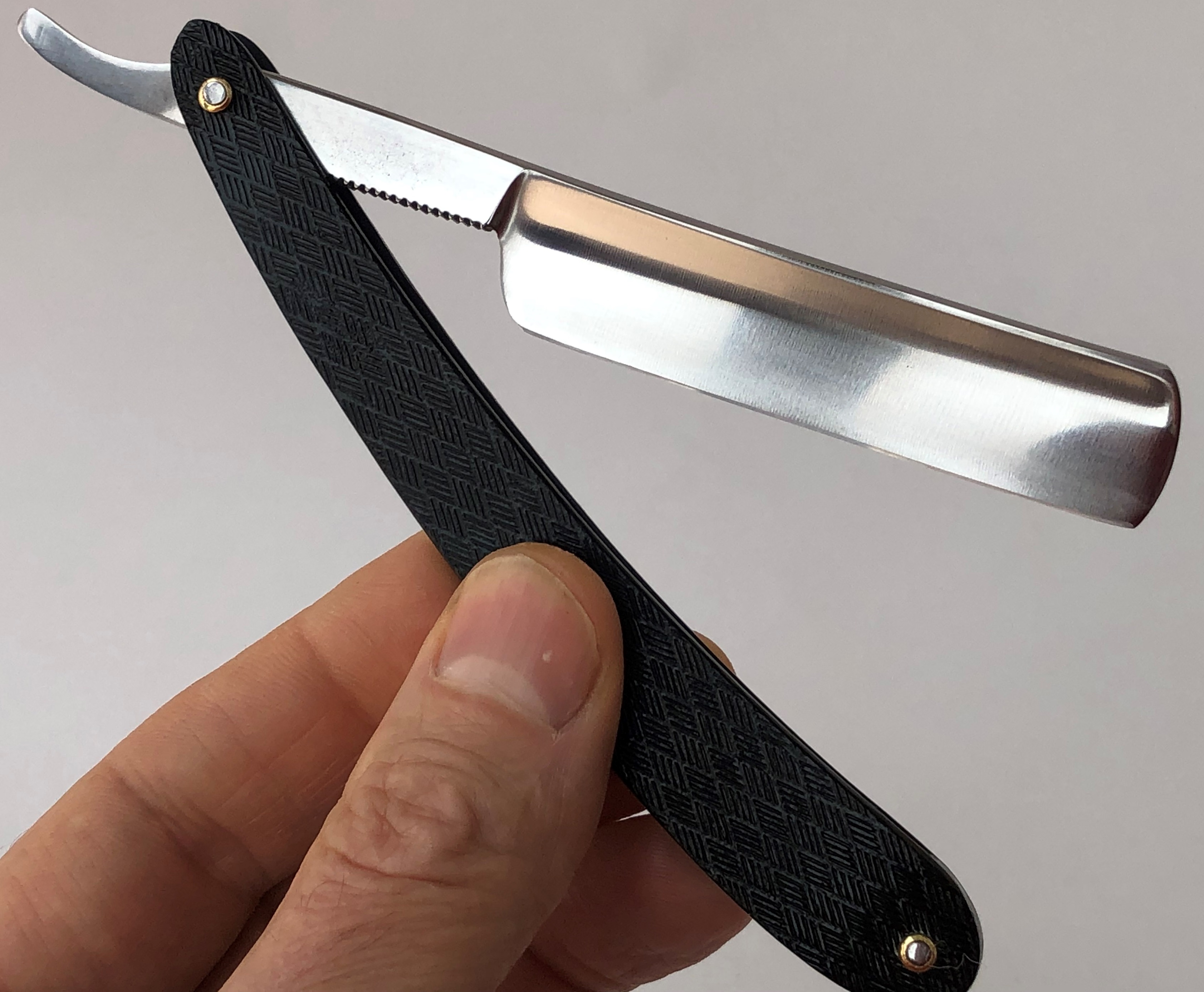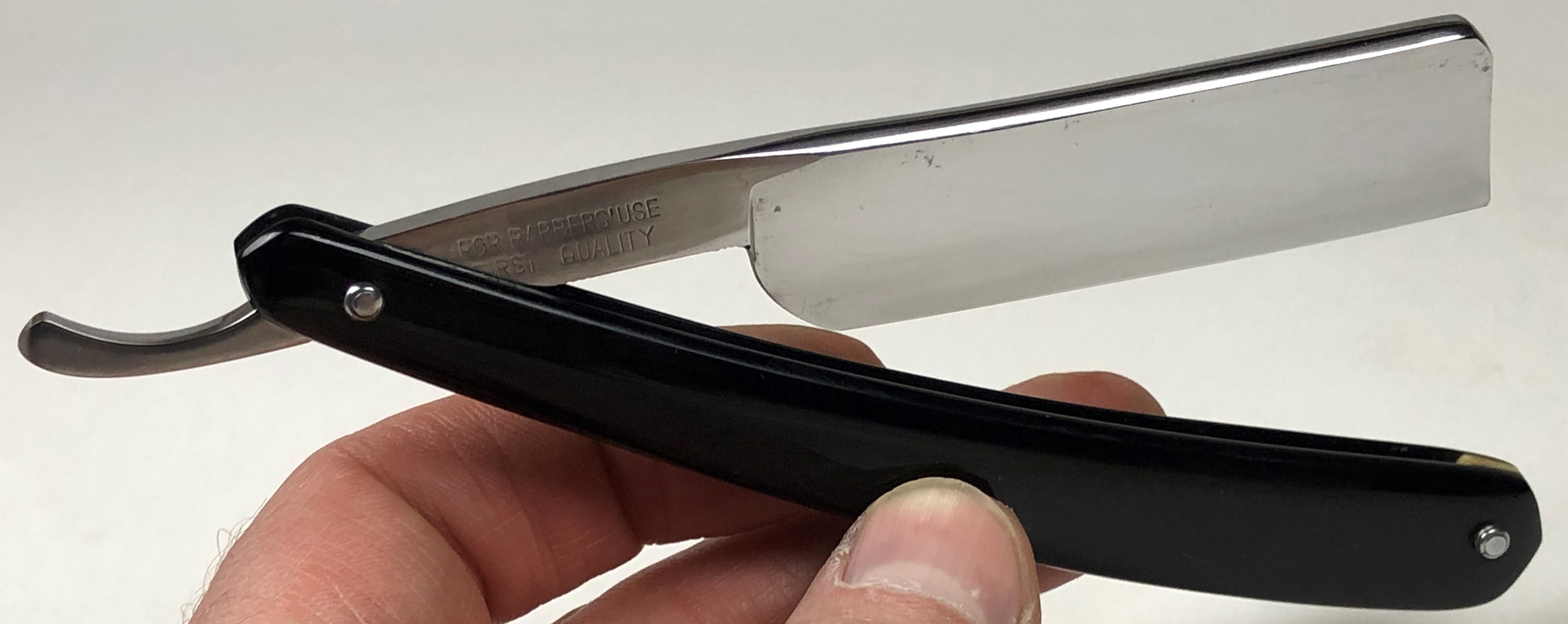 Бритва в пользовании не была.Но пришлось разобрать,чтобы почистить в районе осевого пина. Заодно самую малость освежил само полотно от патины и попробовал повторить "заводской" гринд.Дополнительно поставил внутренние шайбы и поменял оригинальные заклепки на двух-цветные пины.Бритва с виду имеет состояние новой. Идеальная геометрия полотна:кромочка равномерна по всей длине.Качественная сталь способна выдавать чистое и мягкое бритье. Также отличный вариант для новичка. Заточена и готова к бритью.