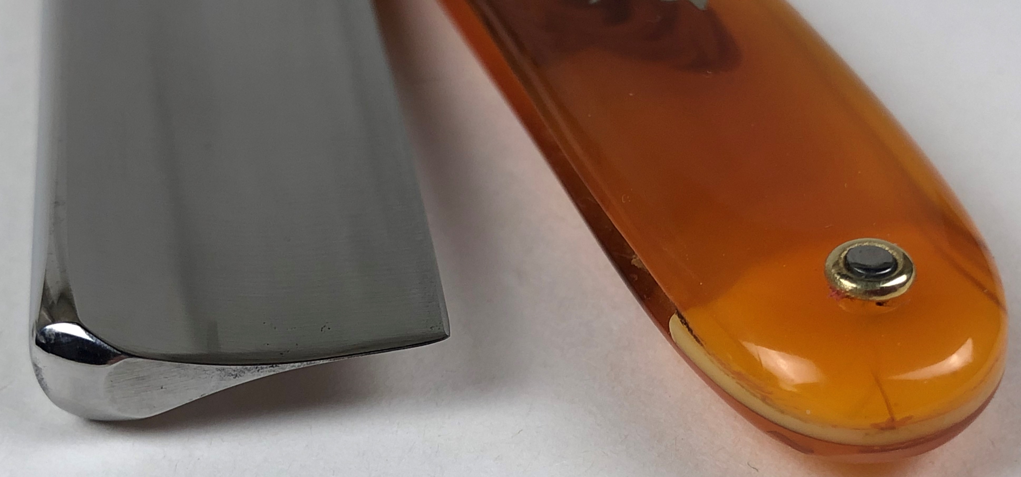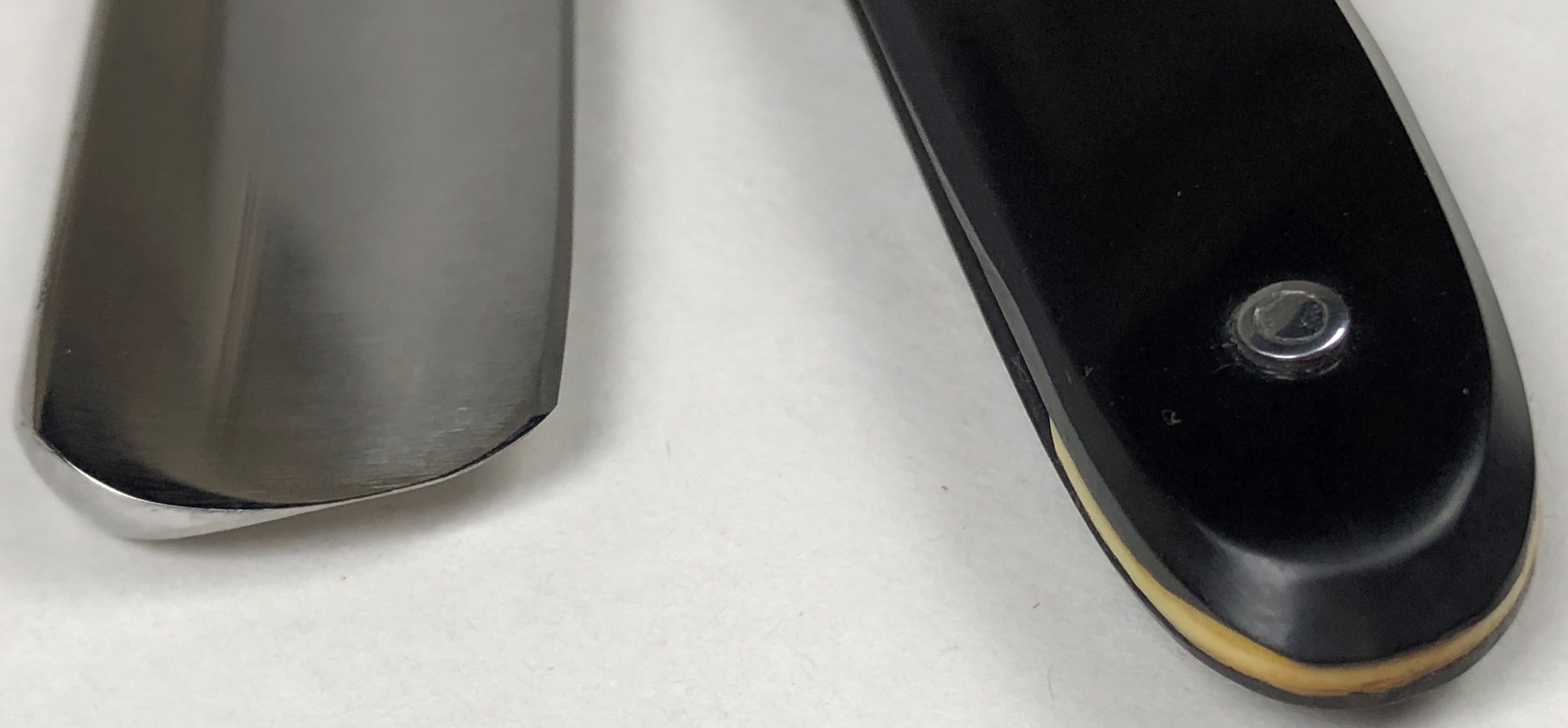 По всей видимости бритва не была в пользовании.Тяжёлый укороченный клинок. Следов от заточных камней на обушке нет и не было.Разобрал бритву, чтобы установить внутренние шайбы, так как без них ручка сильно царапала клинок.Заодно убрал остатки окисления и патины, ну и прошелся косметически по полотну, для порядка. Умеренная полировка.Оригинальные пины удалось заново поставить. Сталь чистая, без дефектов. Кромочка ровненькая по всей длине.Бритва сейчас в состоянии новой.Перед отправкой будет заточена и подготовлена к бритью.