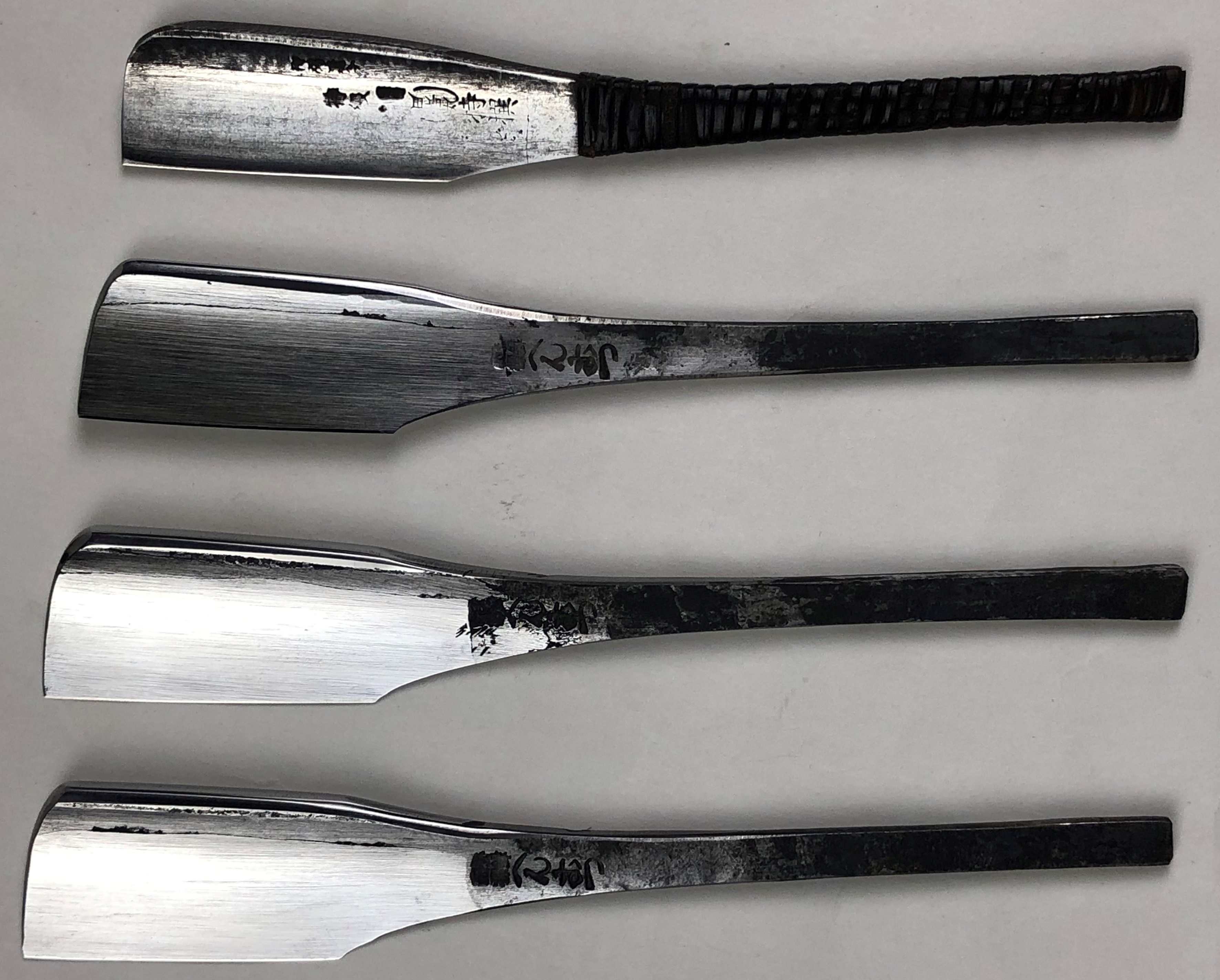 Четвертая бритва имеет шикарную патину на лицевой стороне.Очень красивая обработка металла в районе обушка и части задней стороны.На остальной части продольная шлифовка на камнях.Кромочка также ровная по всей длине.Без следов пользования.Оригинальная оплётка ручки.