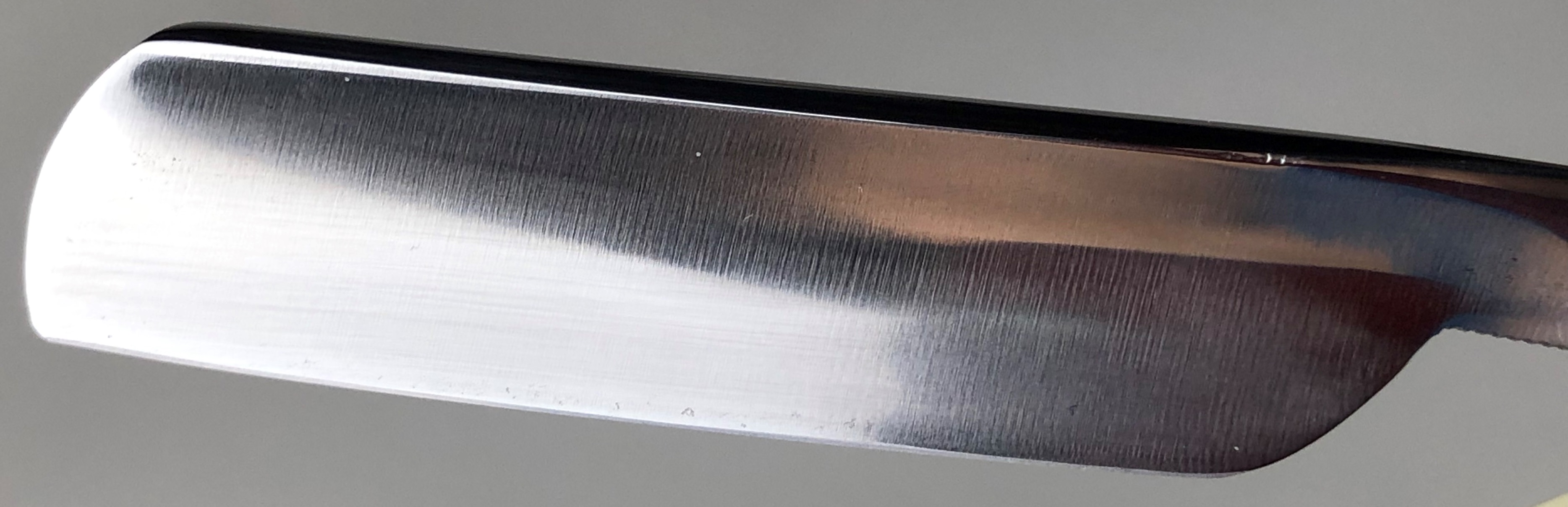 Бритва не разбиралась.Находится в очень хорошем и малопользованном состоянии. Полотно перешлифовал и умеренно отполировал.Идеальная геометрия клинка:кромочка равномерна пов сей длине.Сталь чистая, без дефектов. Заточена и готова к бритью.