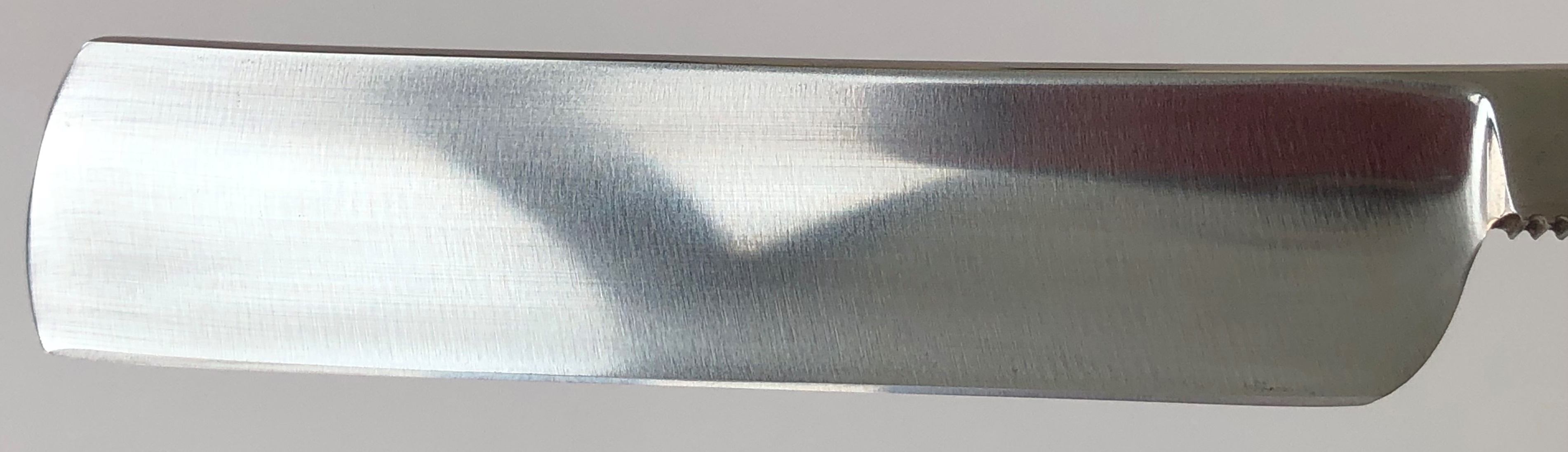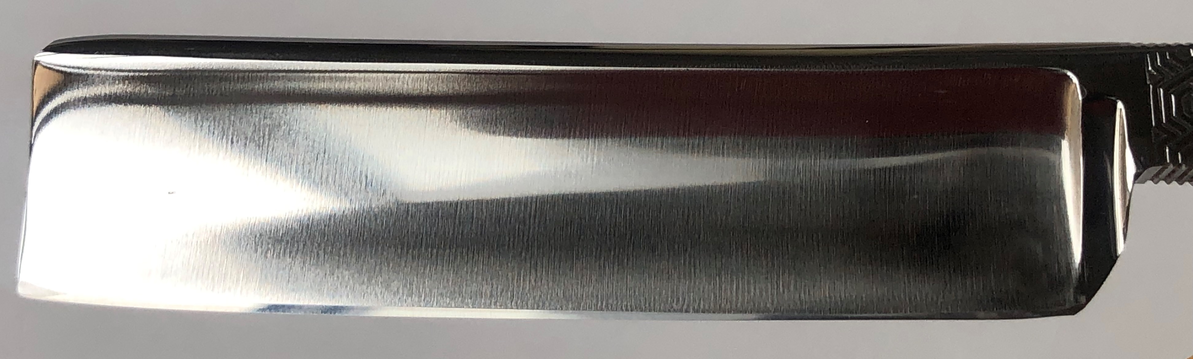 Бритва не разбиралась и не ремонтировалась. Все в оригинале. Заводская заточка была переделана под нормальное бритье.За исключением небольшого и малозначительного окисления с одной стороны полотно, все чисто, без дефектов. Геометрия приближена к идеальной.
