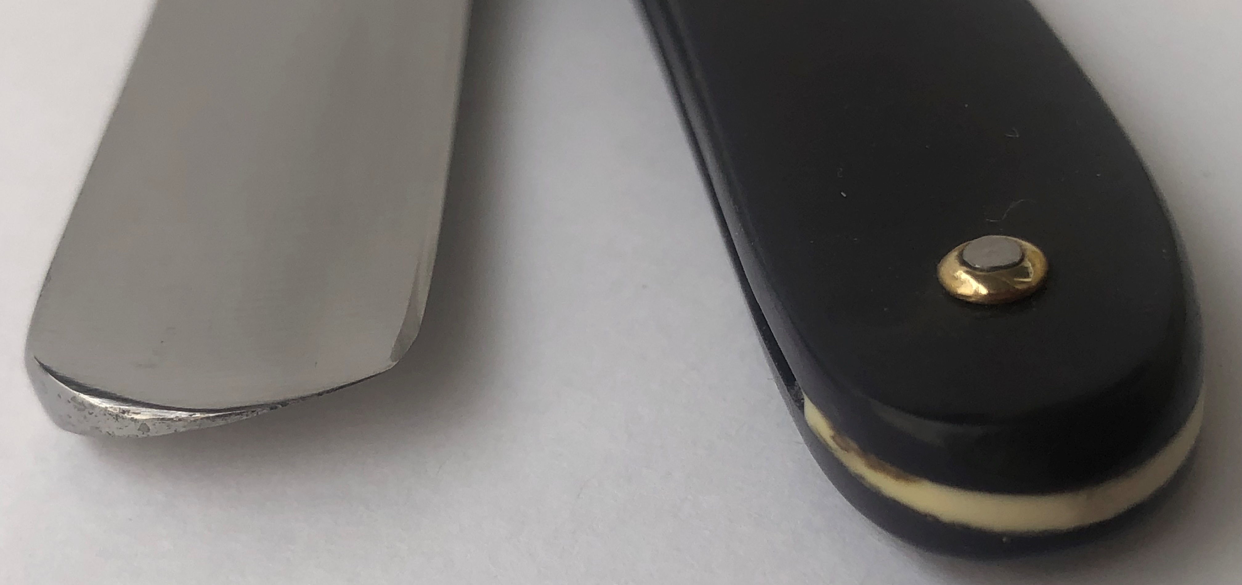 Бритва в хорошем состоянии. Была разобрана, немного почищена и снова собрана,с заменой пинов на втулки и добавлением внутренних шайб.Хоть кромочка и равномерна по всей длине, но присутствует небольшая "волна".УтОчка пятки при заточке, в связи с особенностью геометрии донного клинка. Все это на качество бритья не влияет, зато влияет на конечную стоимость бритвы.