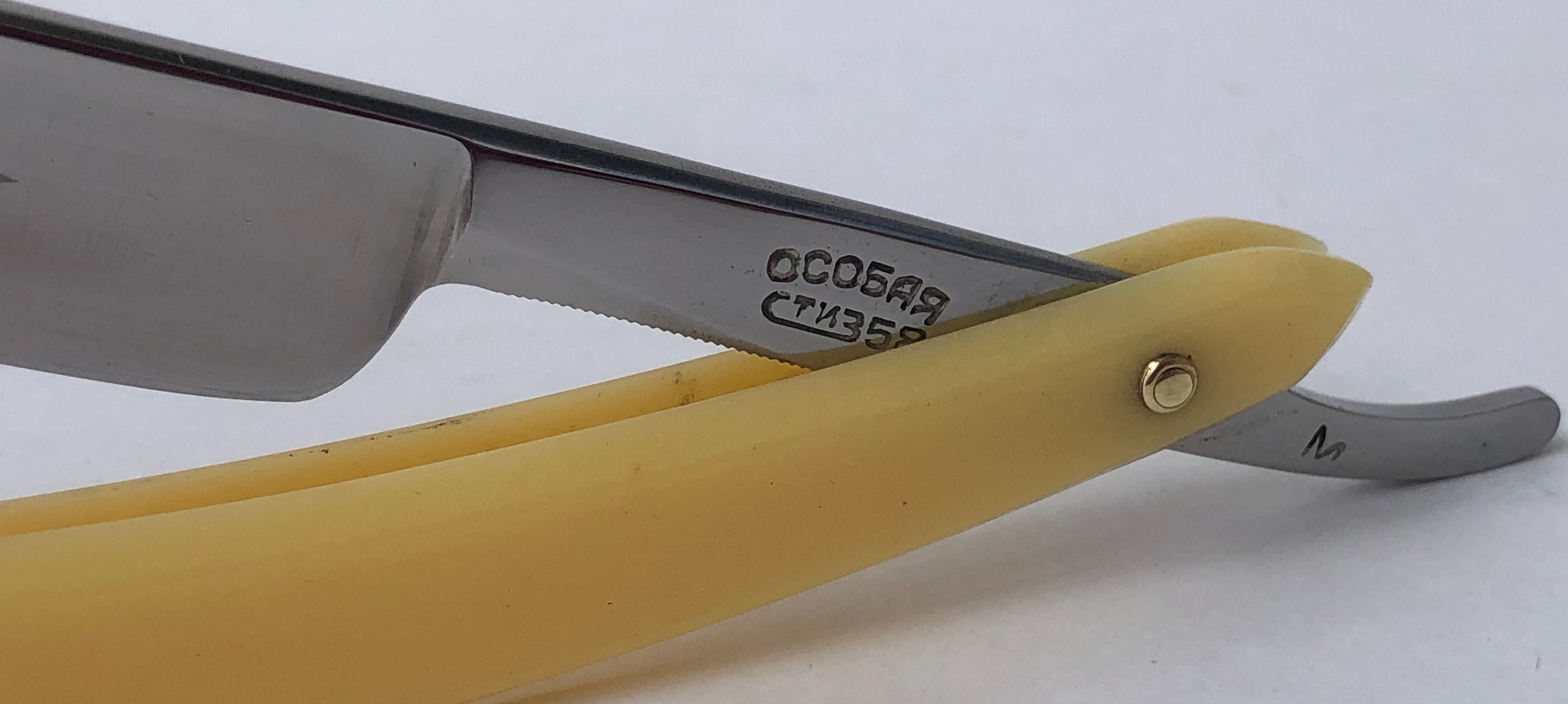 (Хотел обратить внимание на нечеткий штамп.Это заводской нюанс, а не стертость в результате чистки. Есть у меня в коллекции совершенно новая бритва с таким же дефектом, а также ранее попадались 2х-заковные с тем же самым.)