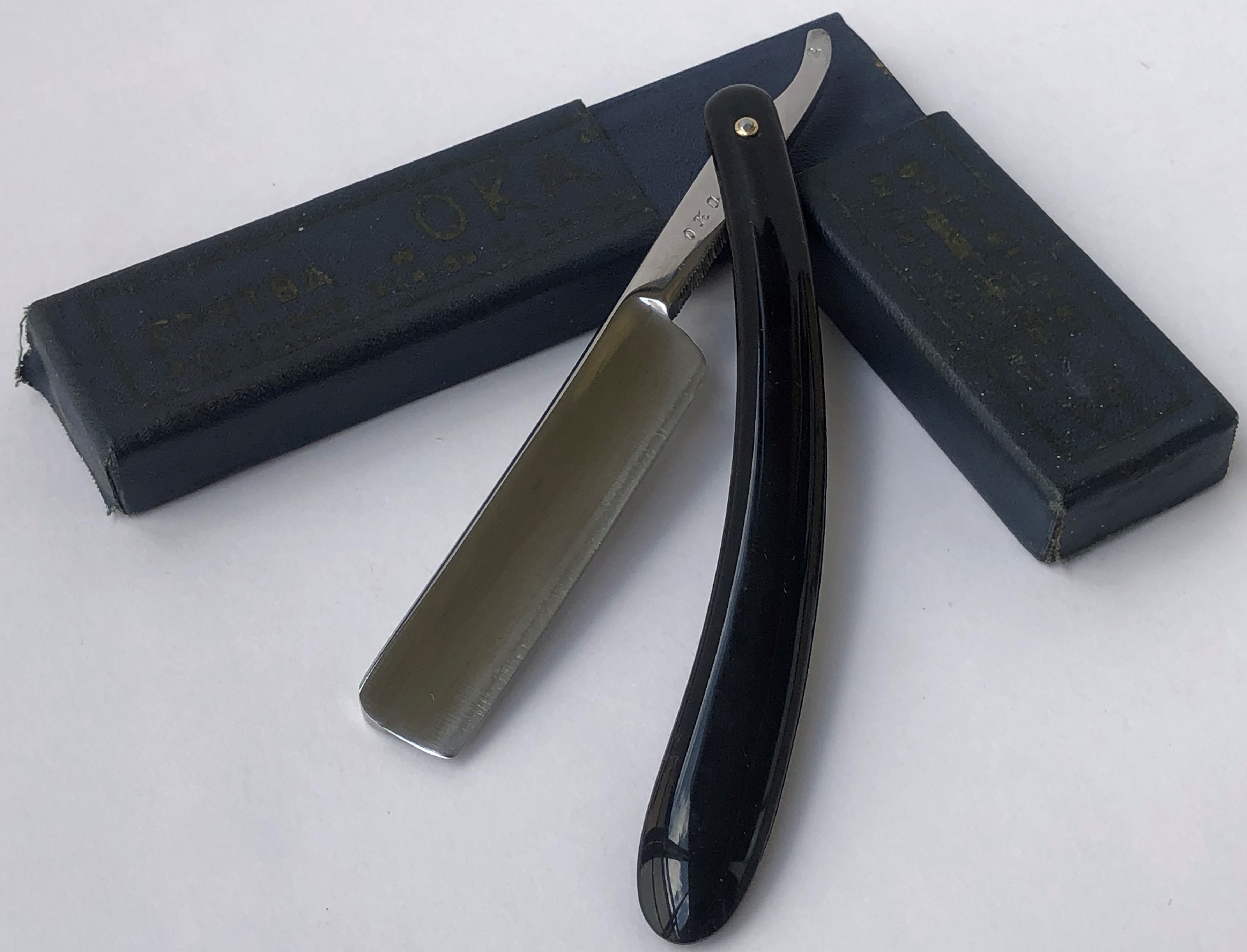Бритва без следов пользования и по всей видимости в работе еще не была.Разобрал, для удаления незначительных "следов времени" и заново собрал, сохранив родные пины , а также добавив внутренние шайбы, для порядка.Бритва в идеальном состоянии, практически как вчера с завода. Кромочка тоненькая.Эффектные и удобные пластиковые накладки на эрле, дают возможность не так ответственно следить за районом осевого пина после бритья и не пропустить образование ржавчины в этом месте. Эта модель немного легче своих "цельнометаллических" собратьев такого же размера, но ко всему можно привыкнуть, так что для кого то это станет преимуществом и бОльшим удобством, чем пользование обычной бритвой.А избыточно толстый обушок даёт возможность не выставлять угол атаки при бритье, а класть бритву плашмя на лицо и таким образом бриться с самым минимальным углом.Бритва заточена и лично протестирована. Напомнила мне английские бритвы с полной вогнутостью, начала 20-го века. Такая же комфортная сталь, средней твердости, с характерным "шелестом" сбриваемой щетины. После бритья кромочка прекрасно проходила тест на рез волоса на весу,без правки на ремне.