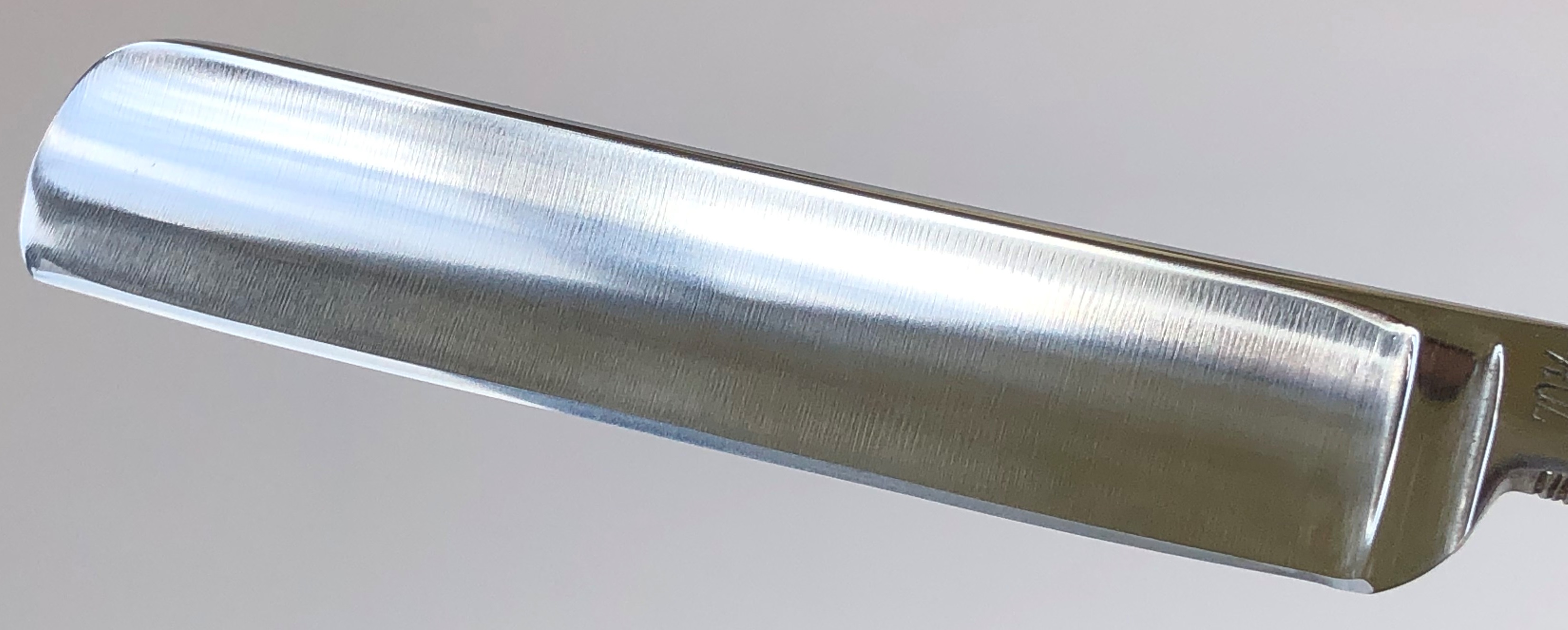 Бритва в очень хорошем состоянии.Непонятно, была ли в пользовании или нет, так как следов на обушке от заточных камней не наблюдается, но ширина полотна неоригинальна.Возможно был изначально скол, а может быть просто правильная и профессиональная эксплуатация.Бритва была разобрана для удаления следов окисления и царапин.Добавил внутренние шайбы и поставил втулку.Кромочка почти равномерна по всей длине. Сталь чистая от видимых дефектов.