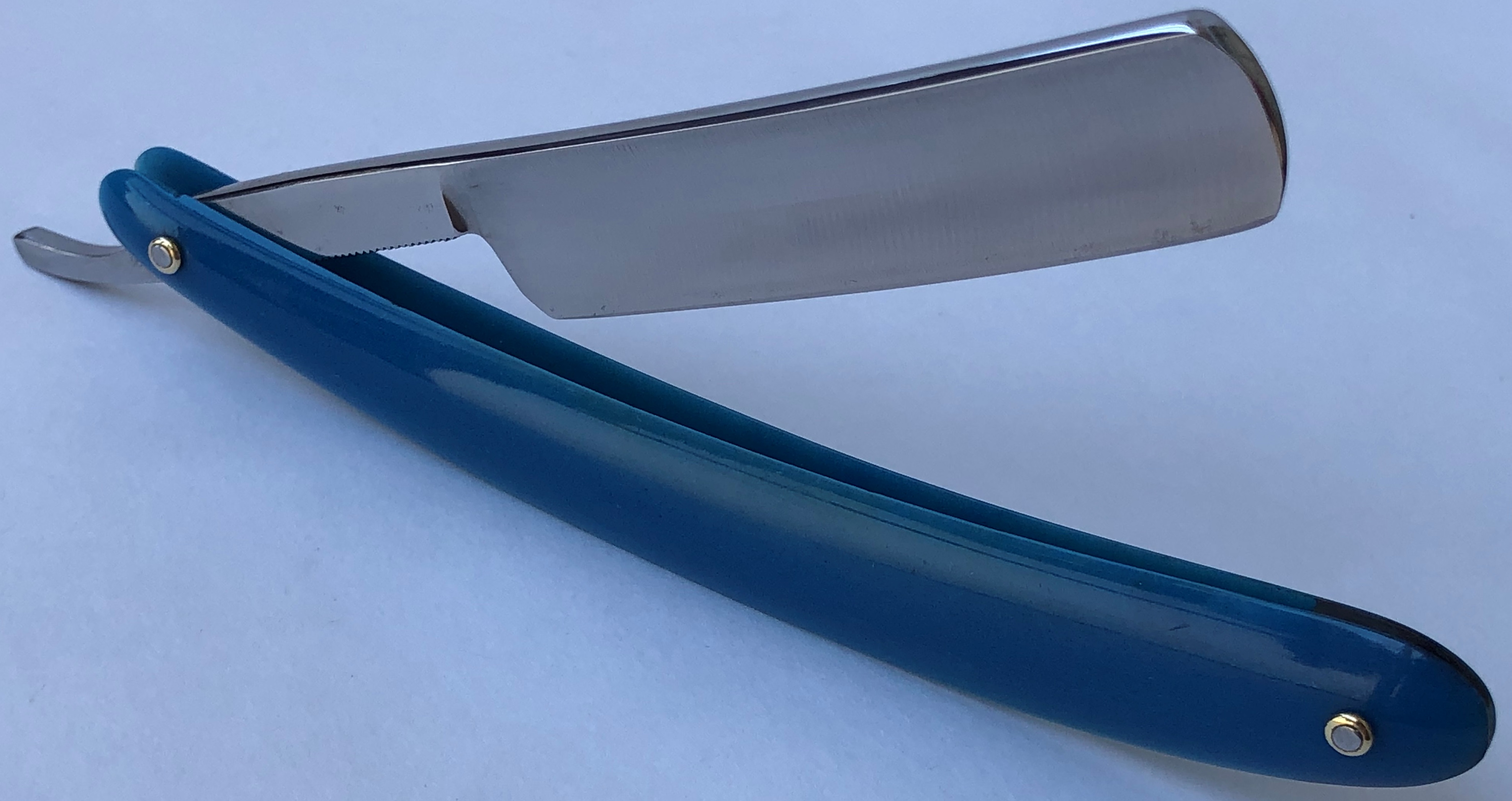 Бритва без следов пользования.Была разобрана, для удаления различных "следов времени" и придания клинку былого блеска.Кромочка равномерна по всей длине.Поменял пины на втулки добавил внутренние шайбы.Красивая и редкая родная оправа, глубокого-бирюзового оттенка.