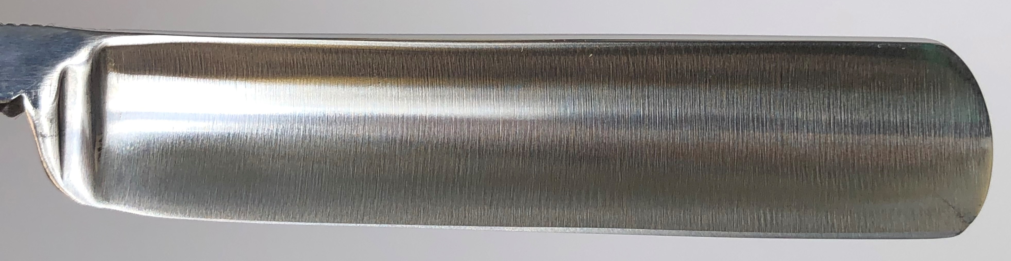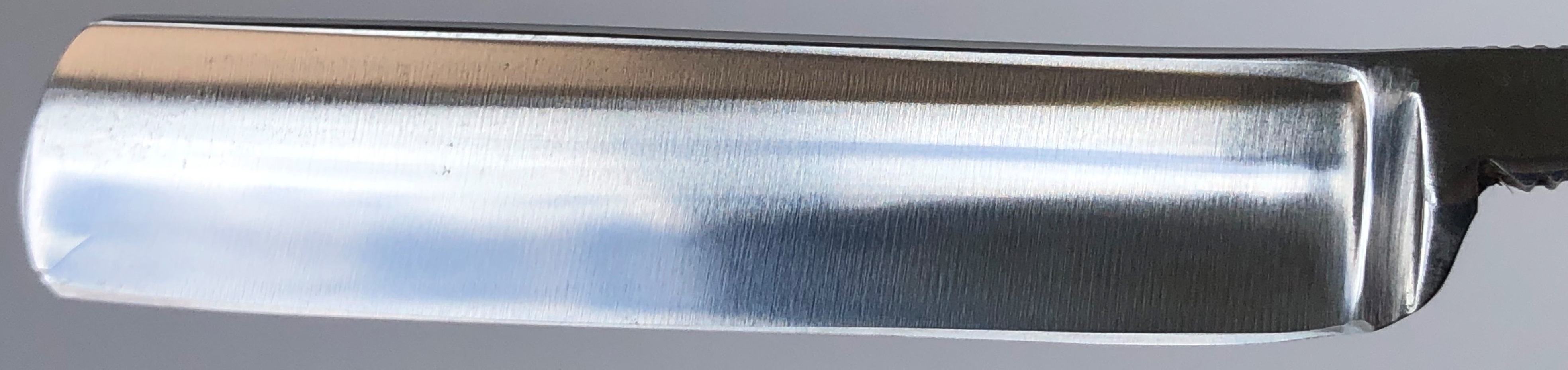 Бритва в очень хорошем состоянии.Непонятно, была ли в пользовании или нет, так как следов на обушке от заточных камней не наблюдается, но ширина полотна неоригинальна.Возможно был изначально скол, а может быть просто правильная и профессиональная эксплуатация.Бритва была разобрана для удаления следов окисления и царапин.Добавил внутренние шайбы и поставил втулку.Кромочка почти равномерна по всей длине. Сталь чистая от видимых дефектов.