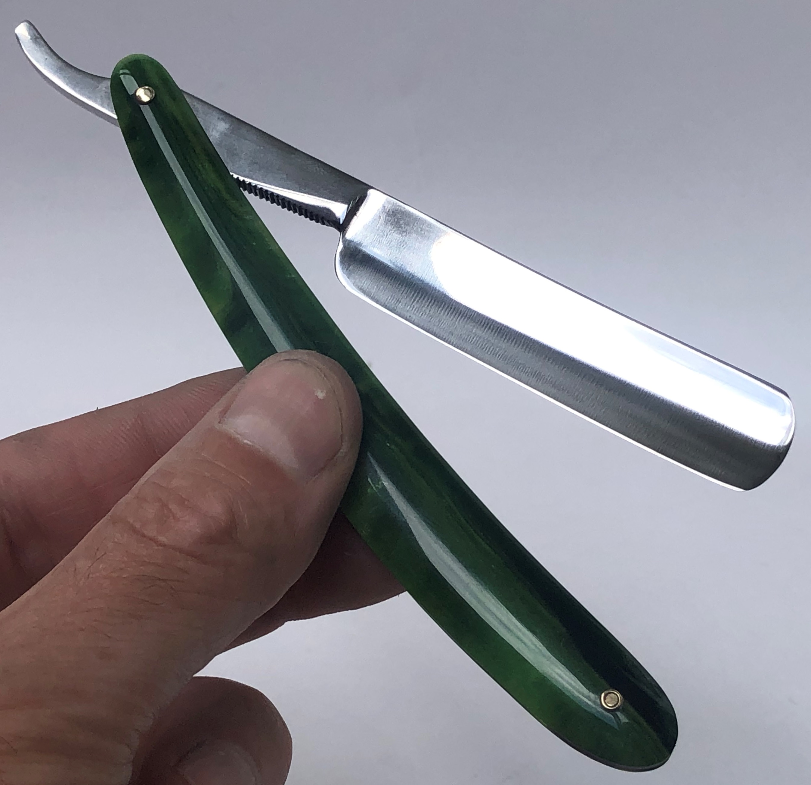 Бритва в очень хорошем состоянии.Непонятно, была ли в пользовании или нет, так как следов на обушке от заточных камней не наблюдается, но ширина полотна неоригинальна.Возможно был изначально скол, а может быть просто правильная и профессиональная эксплуатация.Бритва была разобрана для удаления следов окисления и царапин.Добавил внутренние шайбы и поставил втулку.Кромочка почти равномерна по всей длине. Сталь чистая от видимых дефектов.