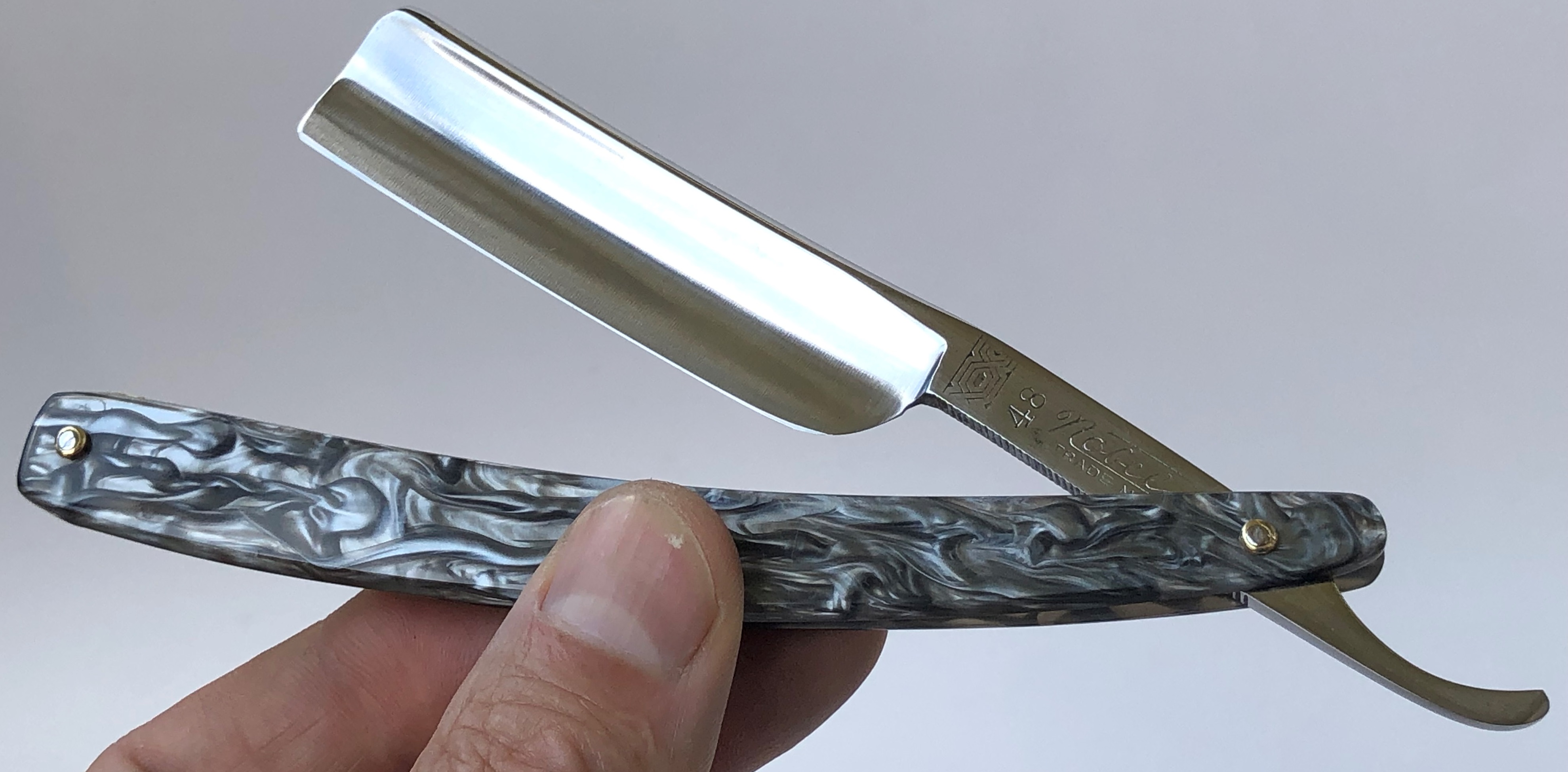 Бритва в очень хорошем состоянии.Непонятно, была ли в пользовании или нет, так как следов на обушке от заточных камней не наблюдается, но ширина полотна неоригинальна.Возможно был изначально скол, а может быть просто правильная и профессиональная эксплуатация.Бритва была разобрана для удаления следов окисления и царапин.Добавил внутренние шайбы и поставил втулку.Кромочка почти равномерна по всей длине. Сталь чистая от видимых дефектов.