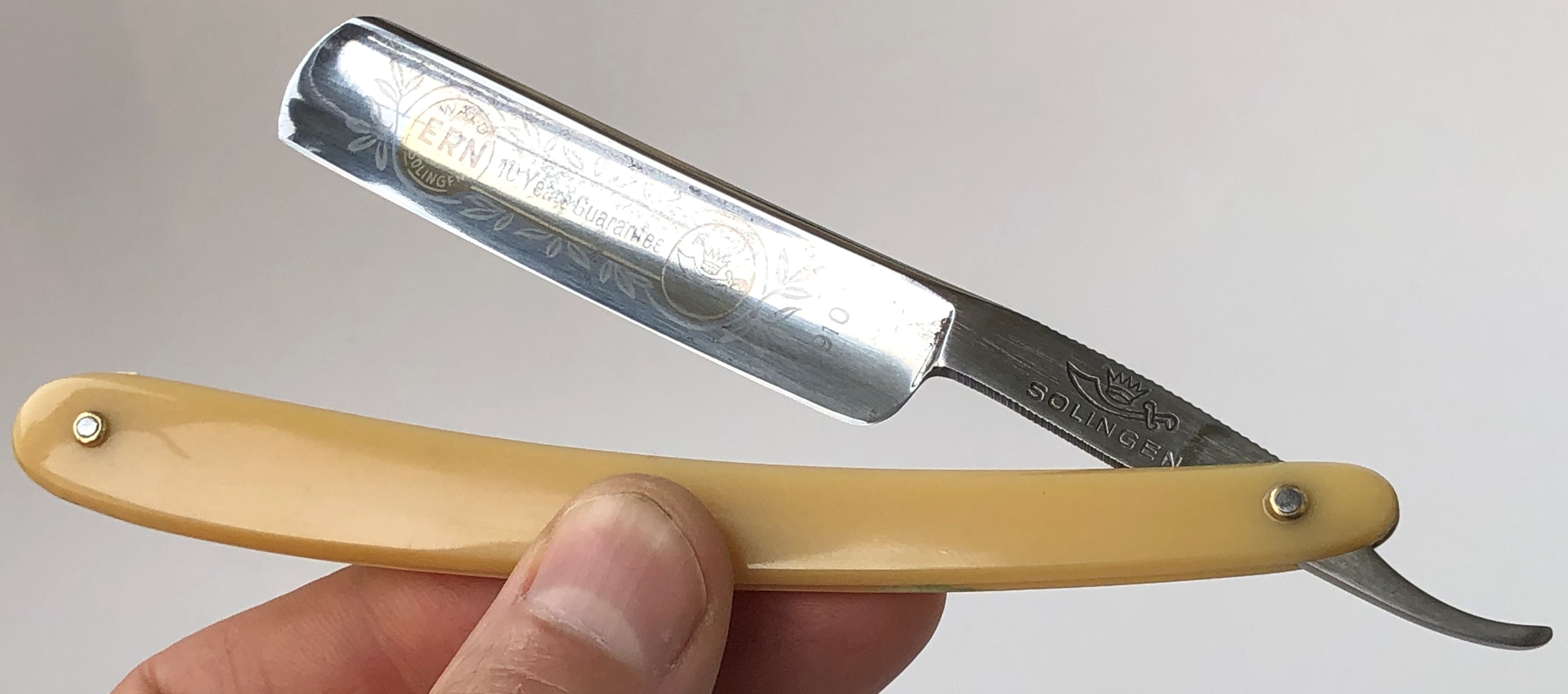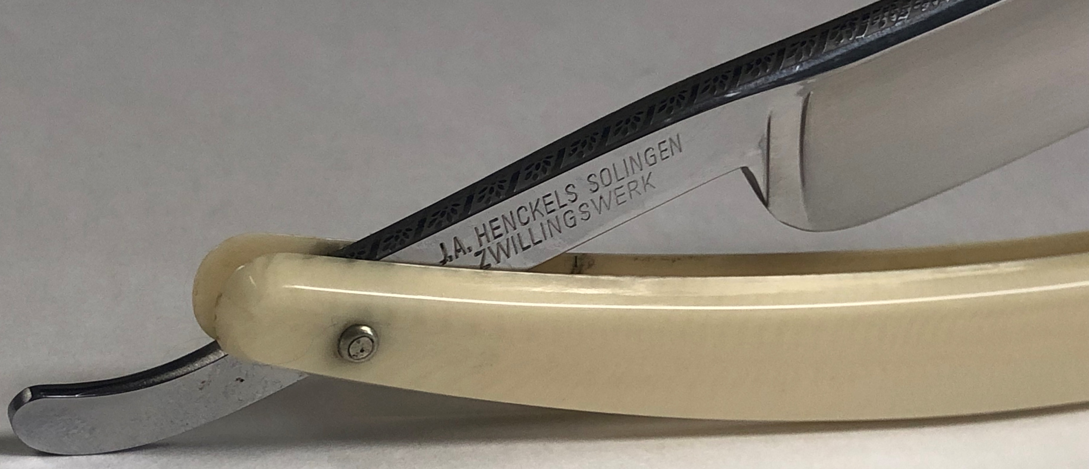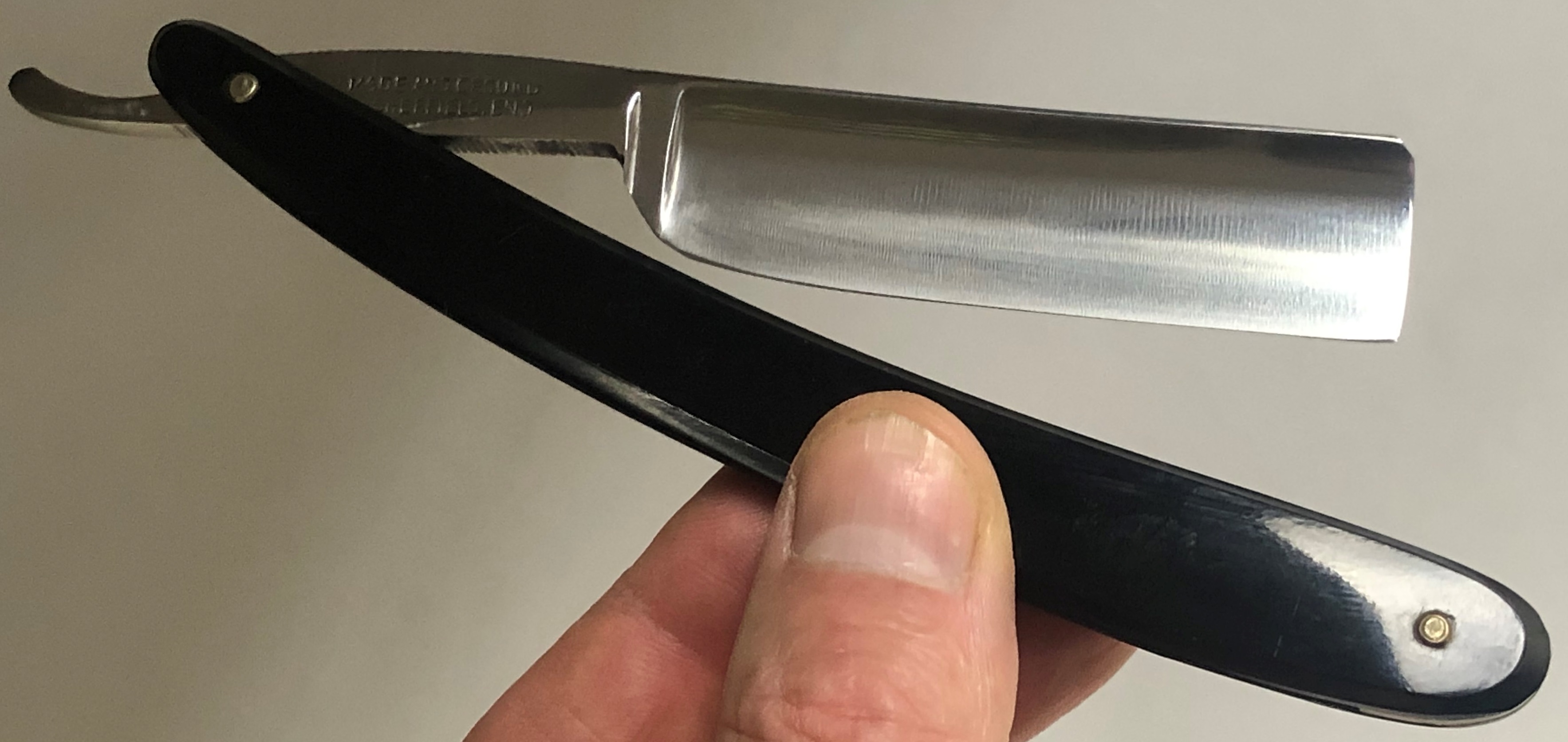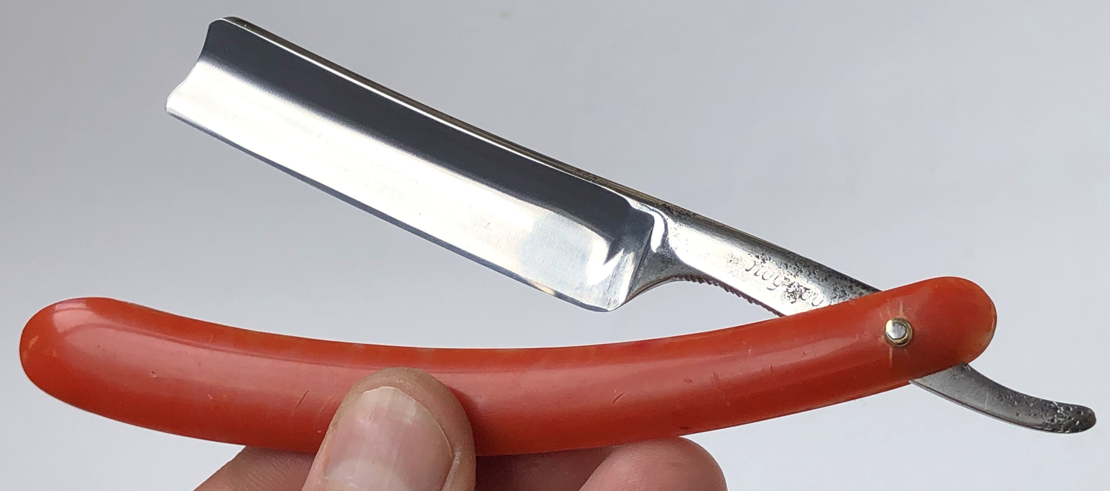 Бритва в очень хорошем состоянии, без активных и еле заметных следов пользования. Ничего не разбиралось и не ремонтировалось. Все в оригинале.Идеальная геометрия полотна.Кромочка чистая от дефектов. Несколько незначительных "точек времени" не стал трогать за ненужностью.Удобная форма клинка. Достаточно тяжелая.Эффектный, ажурный обушок.Очень неплохой вариант для коллекции и для бритья. Исходя из своего опыта могу сказать, что именно нержавеющие стали Фриодур были наиболее подходящие для бритв.
