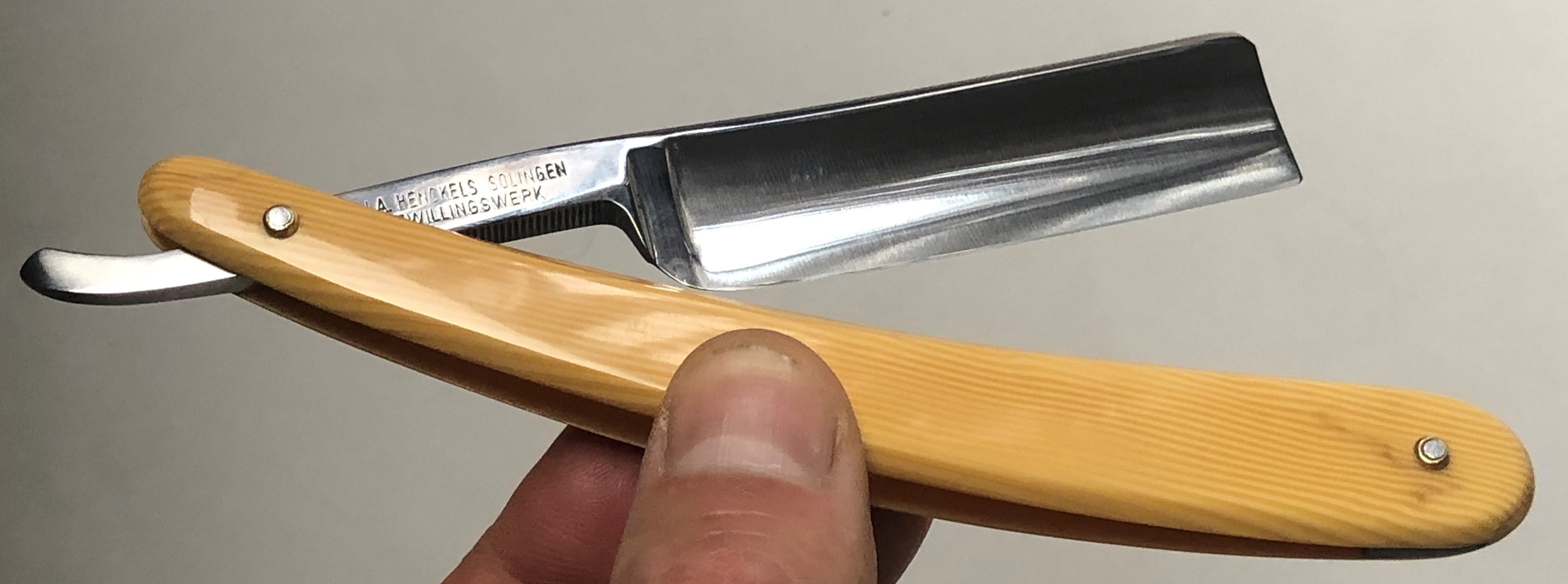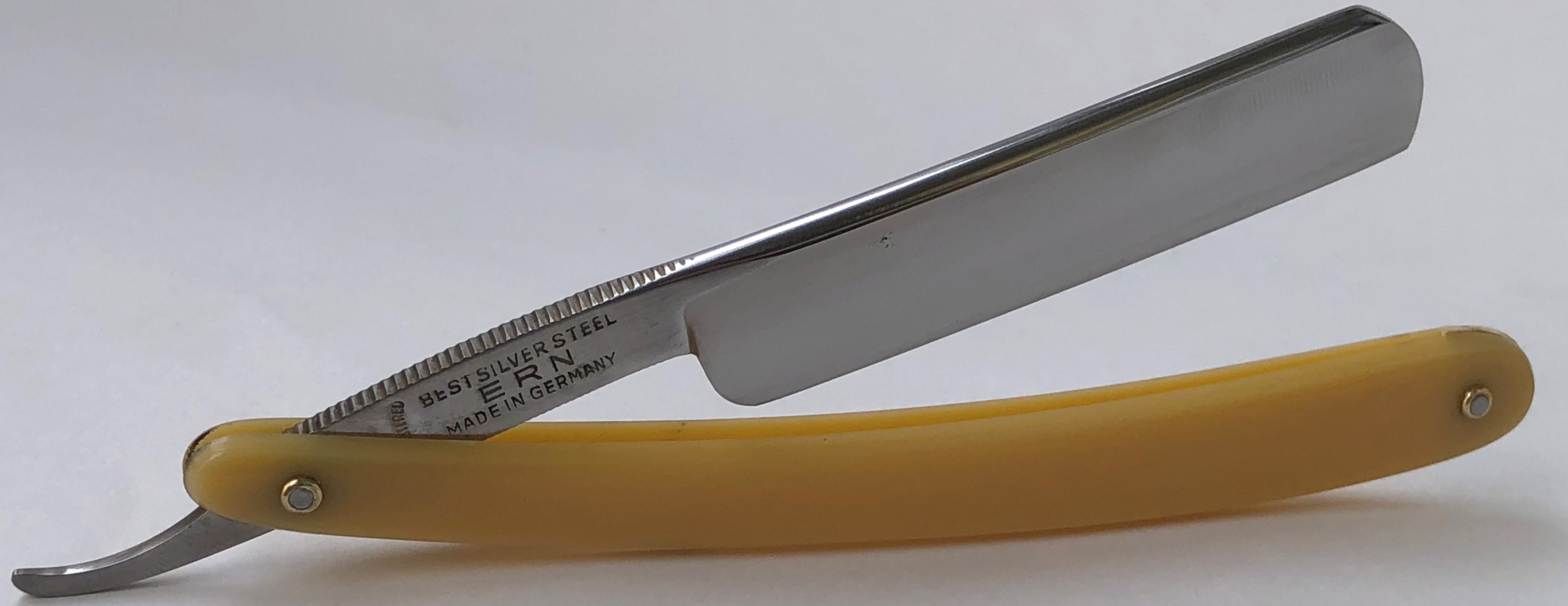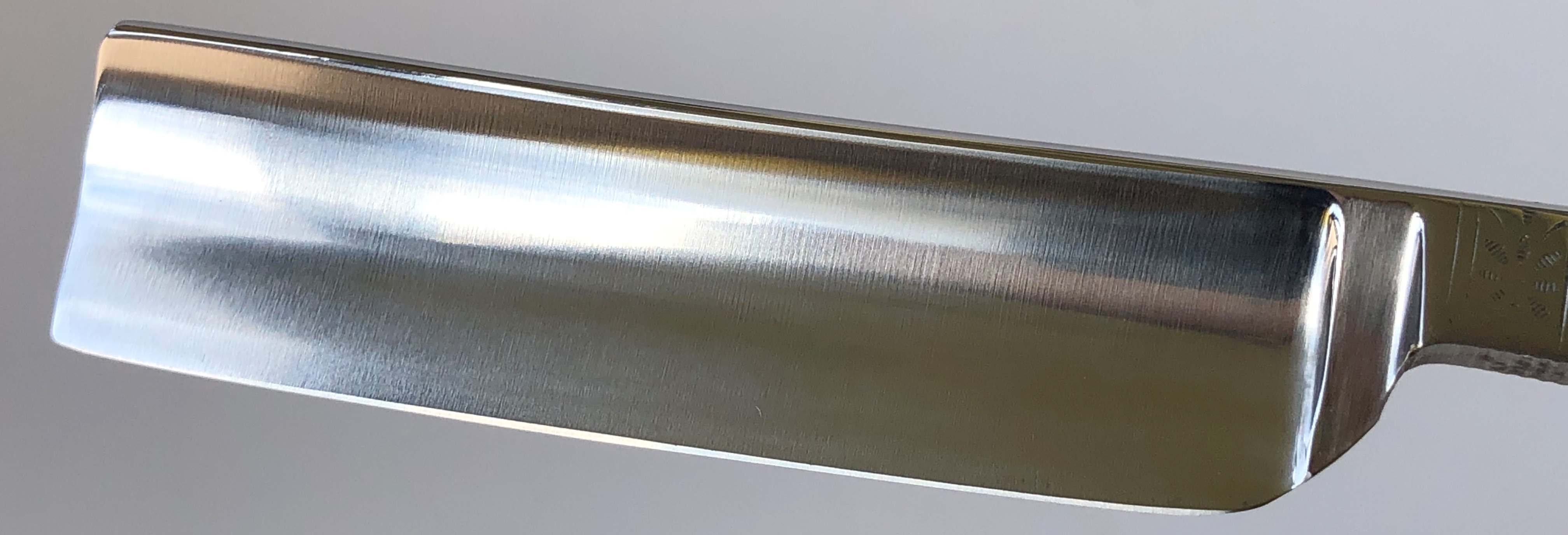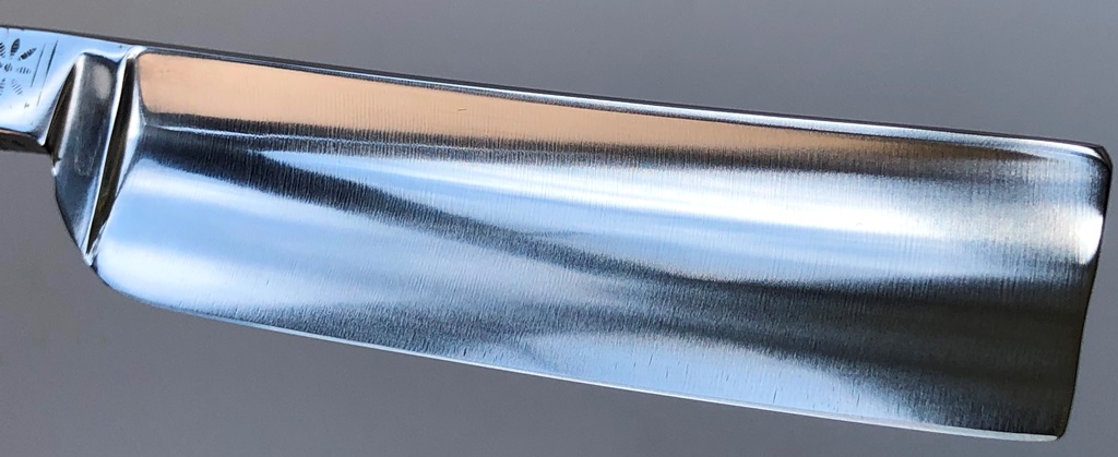 Бритва в очень хорошем состоянии, без активных и еле заметных следов пользования. Ничего не разбиралось и не ремонтировалось. Все в оригинале.Идеальная геометрия полотна.Кромочка чистая от дефектов. Несколько незначительных "точек времени" не стал трогать за ненужностью.Удобная форма клинка. Достаточно тяжелая.Эффектный, ажурный обушок.Очень неплохой вариант для коллекции и для бритья. Исходя из своего опыта могу сказать, что именно нержавеющие стали Фриодур были наиболее подходящие для бритв.