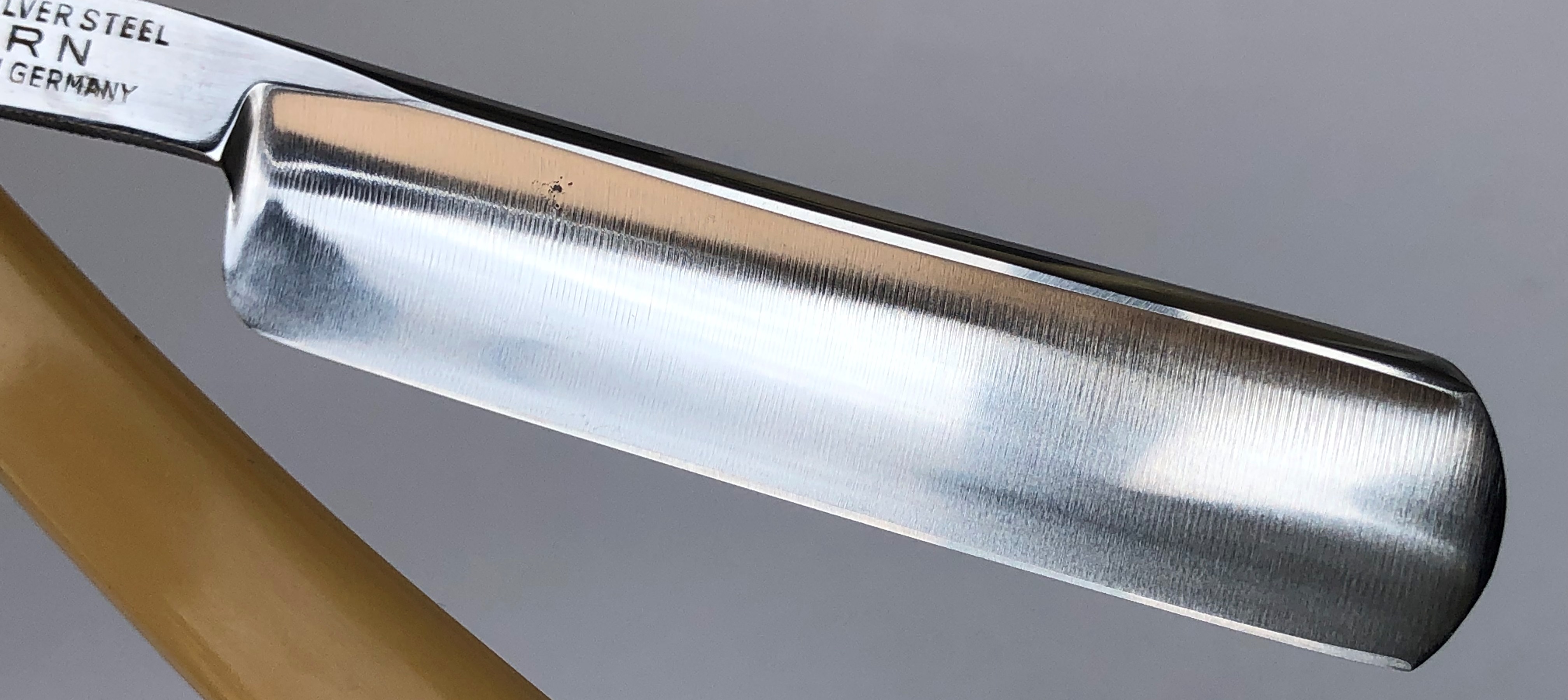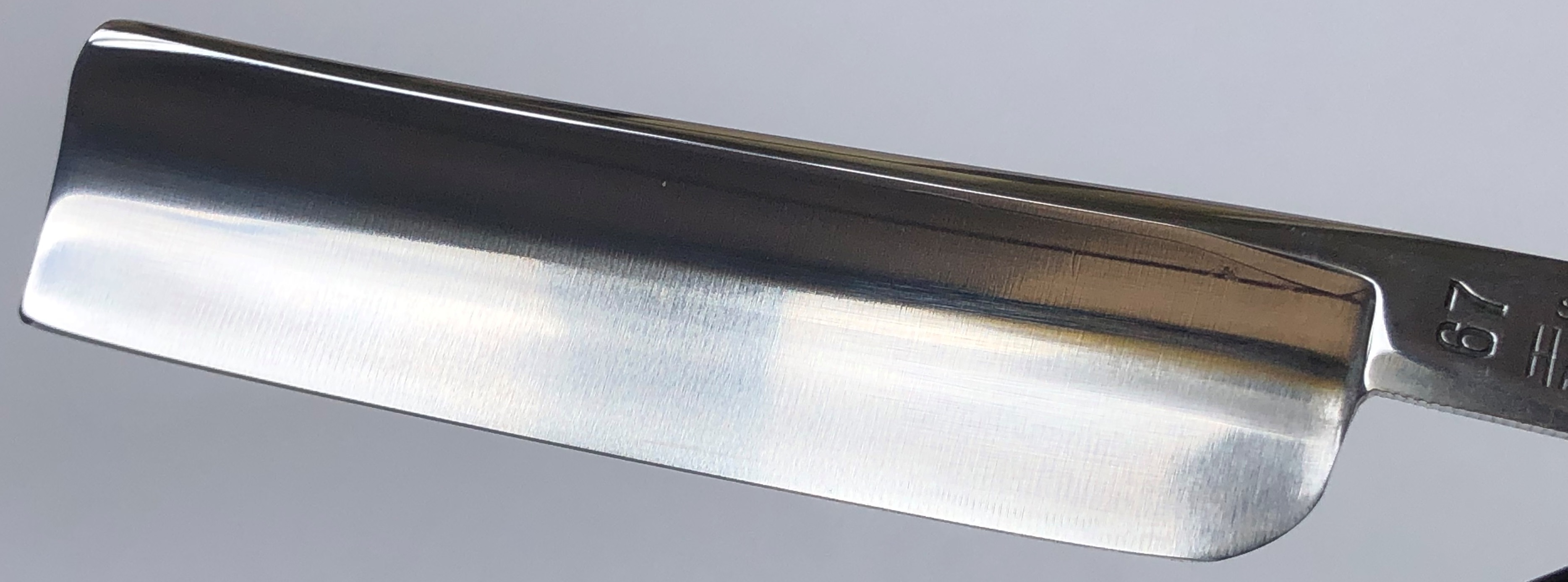 Бритва в очень хорошем состоянии, без активных и еле заметных следов пользования. Ничего не разбиралось и не ремонтировалось. Все в оригинале.Идеальная геометрия полотна.Кромочка чистая от дефектов. Несколько незначительных "точек времени" не стал трогать за ненужностью.Удобная форма клинка. Достаточно тяжелая.Эффектный, ажурный обушок.Очень неплохой вариант для коллекции и для бритья. Исходя из своего опыта могу сказать, что именно нержавеющие стали Фриодур были наиболее подходящие для бритв.