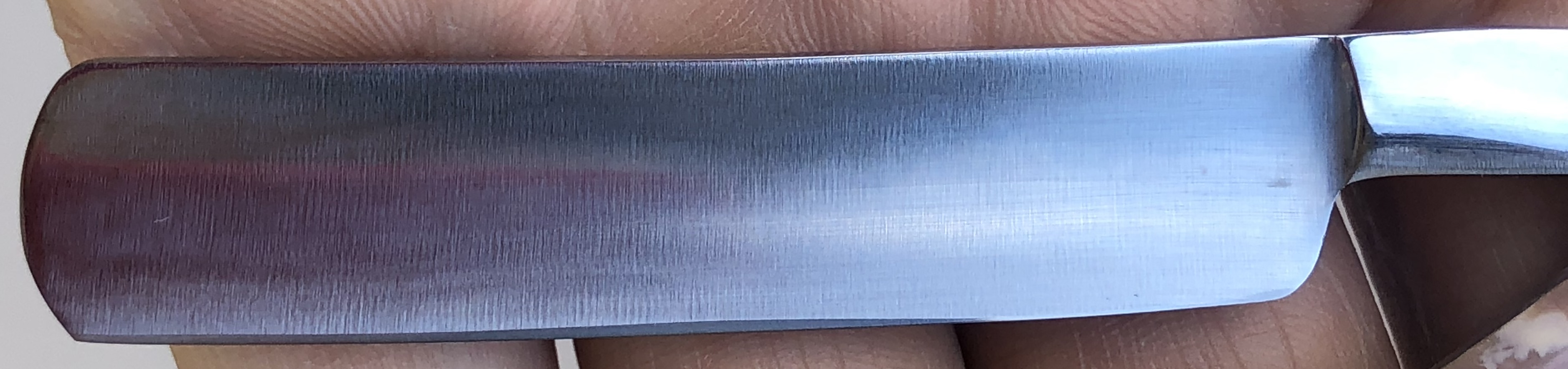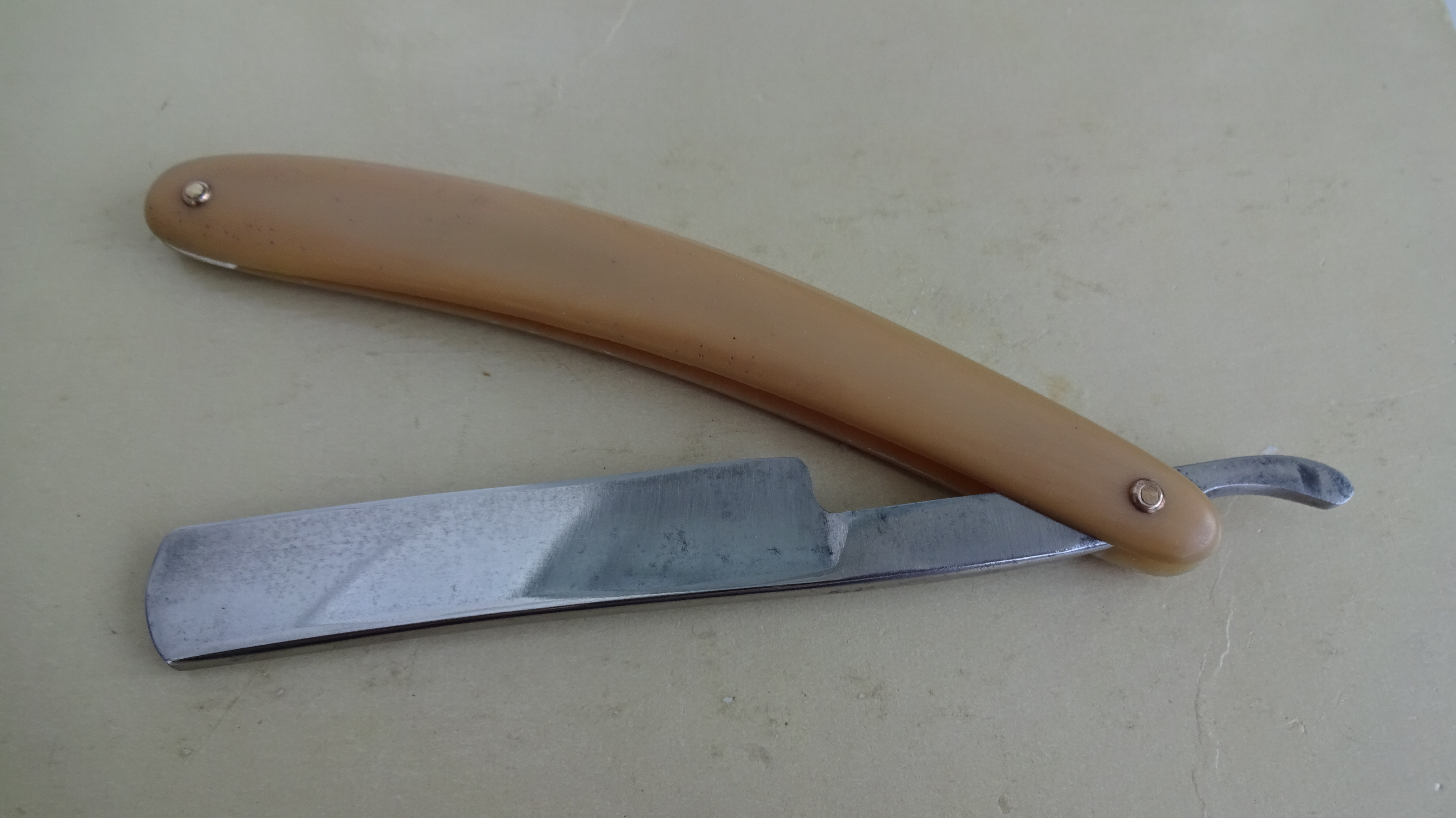 Получил вчера бритвочку *Арт.Бритва*.Убитая немного,но интересная.Клеймо такое еще не встречалось-модель 75.Год выпуска не указан,пластик на рукоятке светлый очень,даже какой-то розоватый.Стоит клеймо 2с.Предполагаю,второй сорт из-за замина на обушке сверху(как бы приплюснут)и эрль немного отклонен от лезвия с сторону,хотя само лезвие ровненькое,т.е.геометрия его вполне нормальная.Видно,что от пасты лезвие поуточилось местами,да и следы наждака обнаружил.Обух-4.1мм,длина клинка-7,3мм.Ширина:пятка-15,2мм,самое уточеное место-14.3мм,носик-14,7мм.Интересен еще и клинышек.он абсолютно прямой.бритва,по моему мнению,не разбиралась,пины родные,медь.Я сначала разобрал,не подумал сфотографировать в неразобраном виде.Потом дошло только.
