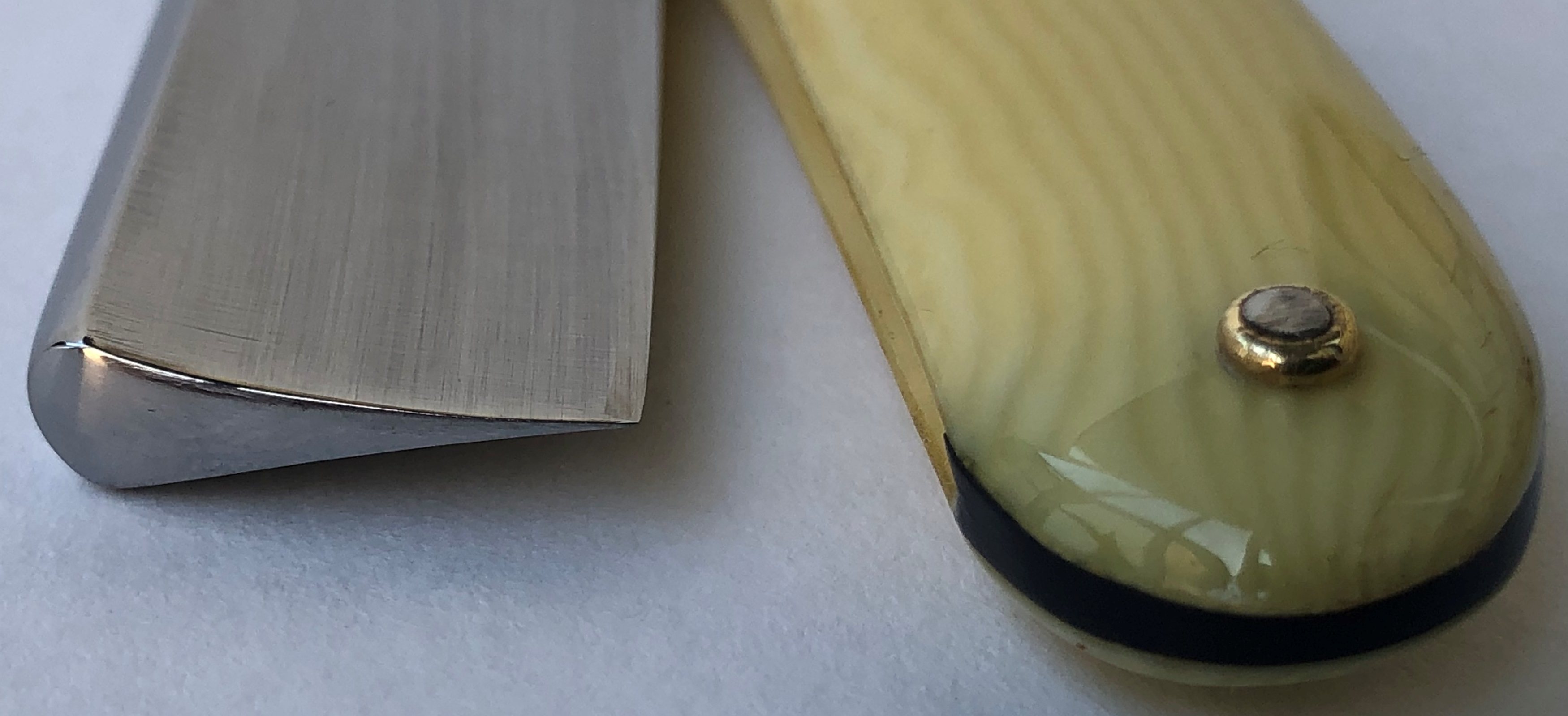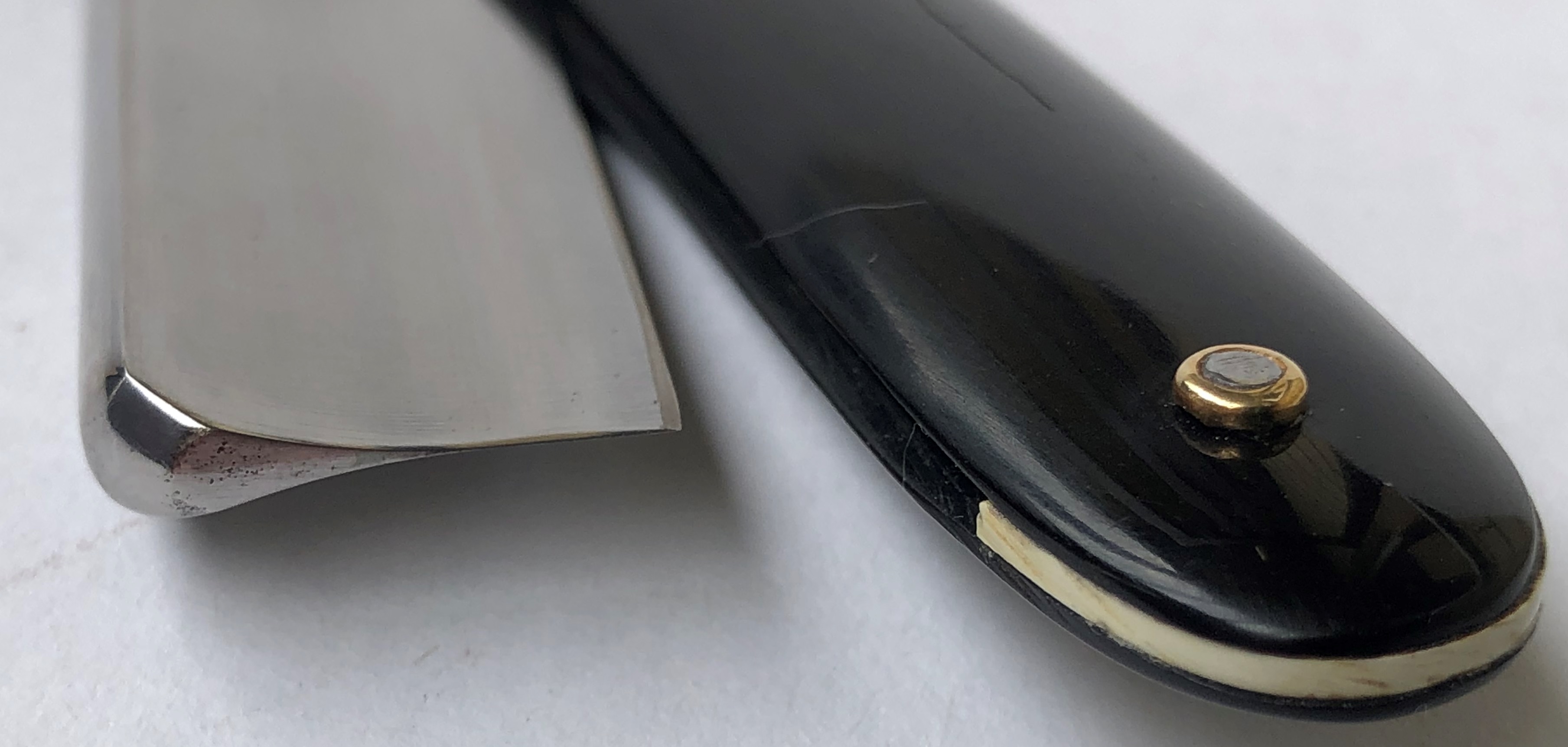 Бритва в очень хорошем состоянии, без активных и еле заметных следов пользования. Ничего не разбиралось и не ремонтировалось. Все в оригинале.Идеальная геометрия полотна.Кромочка чистая от дефектов. Несколько незначительных "точек времени" не стал трогать за ненужностью.Удобная форма клинка. Достаточно тяжелая.Эффектный, ажурный обушок.Очень неплохой вариант для коллекции и для бритья. Исходя из своего опыта могу сказать, что именно нержавеющие стали Фриодур были наиболее подходящие для бритв.