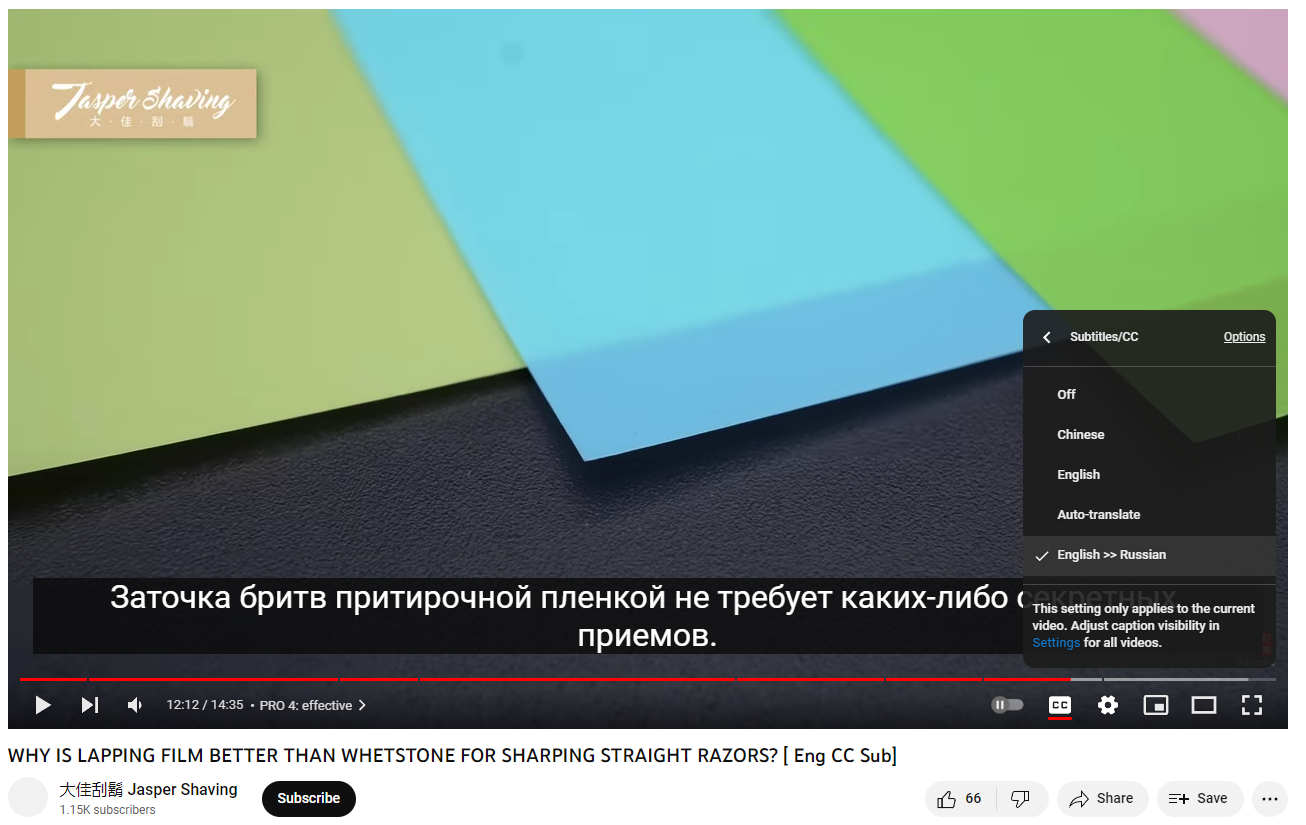 Китайцы учатВ ролике про заточку на пленках есть субтитры на английском. В настройках Ютуба (где шестеренка справа под экраном) можно включить автоперевод на русский, на экране будут идти русские субтитры. Перевод не идеальный, но вполне рабочий.