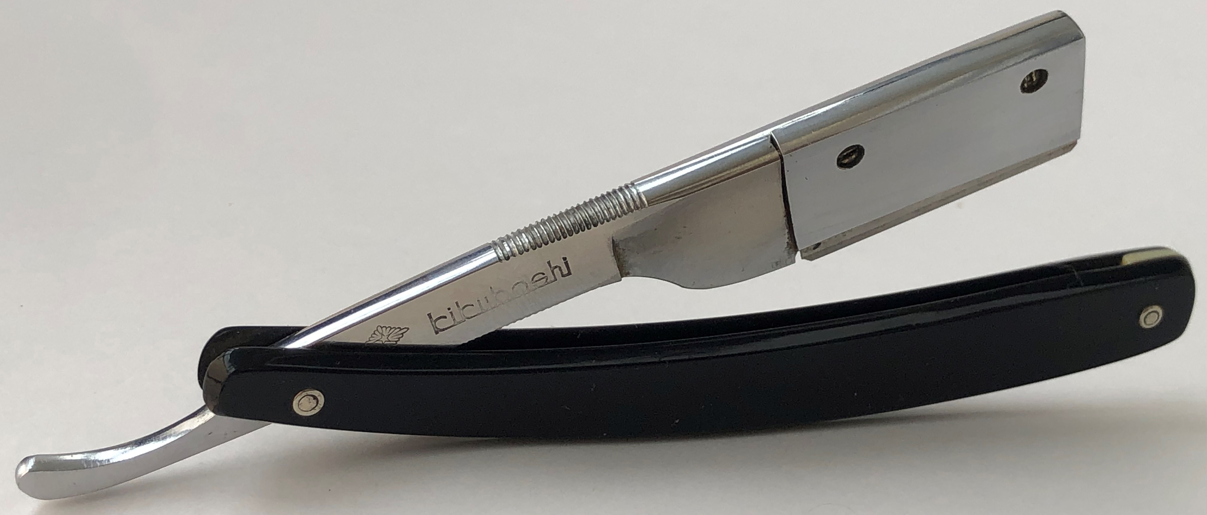 Шикарная и редкая коллекционная вещь. Одни из самых желанных японских бритв для любой коллекции, каждого разор-маньяка.Бритва в пользовании не была, но для порядка разобрал, чтобы удалить немного лишнего окисления в районе осевого пина, не стирая эффектное (родное) воронение эрля.Оригинальные пины были также перебраны и заново установлены, с добавлением еще по одной шайбе с каждой стороны, для усиления конструкции. Продольная ручная шлифовка камнями, по принципу шлифовки катан.Почти "зеркало"с элементами сатина.