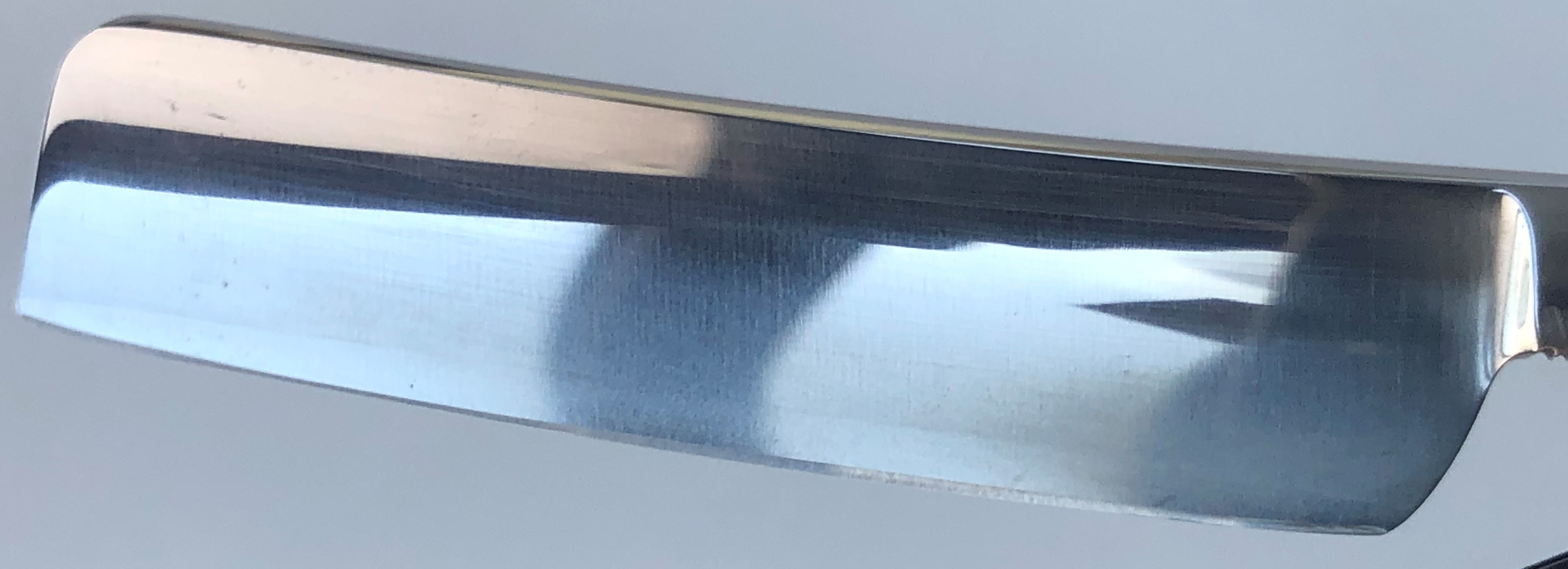 Бритва в идеальном состоянии.Только отчистил от остатков масла с консервации. Ничего не разбиралось и не реставрировалось. Оригинальная шлифовка и полировка.Кромочка равномерна по всей длине и еле заметна.Сталь чистая, без видимых дефектов. (Не считая практически незаметных пятнашек у носика, от взаимодействия металла и платика оправы).Я не помню, чтобы мне попадалась SK-3 и шириной полотна в 22 мм. Крупная и тяжёлая. На некоторых 3-ках я не наблюдал фирменной "ступеньки" на полотне, как на бритвах 1-й и 2-ой модели.Тут эффектный "переход жесткости" имеется, так что все в норме.