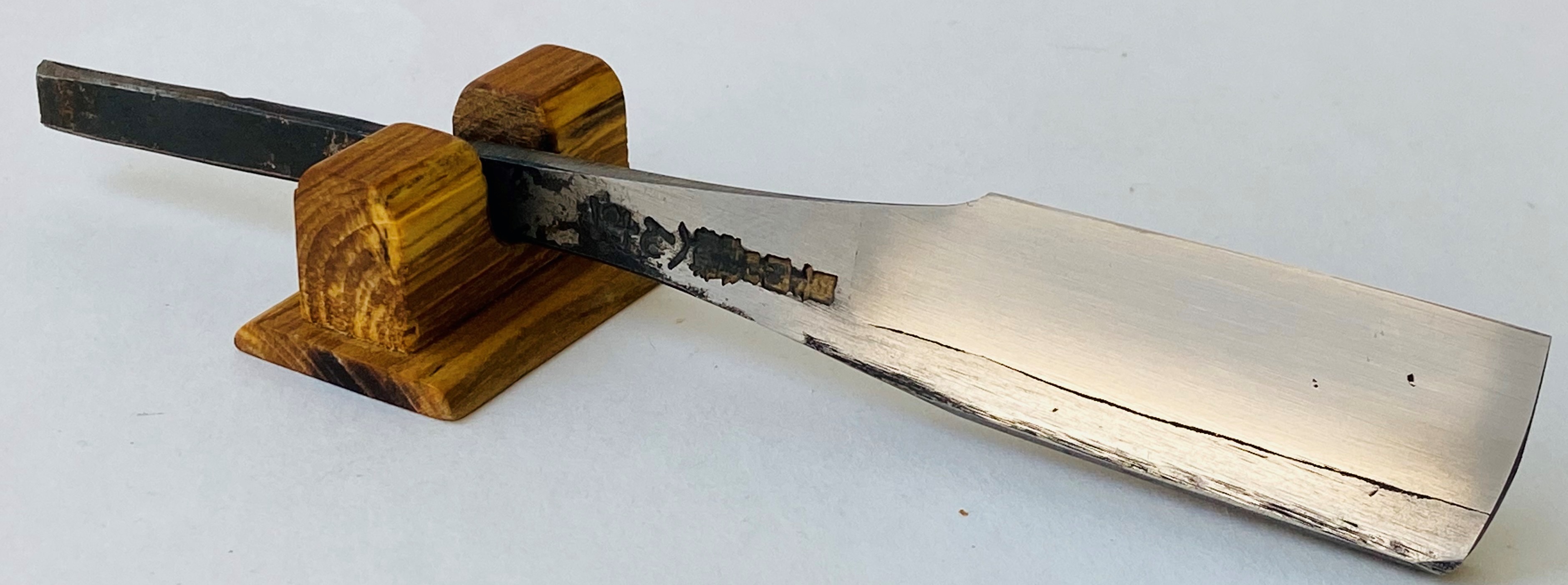 1.Ширина полотна-27 мм! или почти 9/8! Толщина обушка-6.2 мм. 2.Ширина полотна-25.5 мм или 8/8! Толщина обушка-6.2 мм. 3.Ширина полотна-23.0 мм или 7/8! Толщина обушка-5.0 мм. Две бритвы определить удалось: 日下開山-Кусака Кайсан. По видимому это имя мастера. Бренд-へんこつ☆大刃-ХЕНКОТЦУ-Большой клинок. Все три примерно 50-60-х годов прошлого века. Бритву в коробочке определить не удалось,но это не отменяет ее высокое качество изготовления. Бритвы коллекционного состояния. Непользованные и не точены еще. Находились в заводской смазке,завернутые в бумажки.С бритвами ничего не делалось,даже не полировалось. Все как вчера с завода.Заводскую заточку переточил,чтобы посмотреть геометрию бритв.В этом плате все тут очень хорошо.Первые две очень редкие в таком размере и весе в 65 грамм.Так что не пропустите. Бритвы созданы классическим способом,в виде сварки из двух частей и комбинированной продольно-поперечной шлифовкой. После продажи будут заточены и доведены до состояния бритья. Цена-35500-30500-28500 р с доставкой. Внимание! Важная информация! Spoiler Show