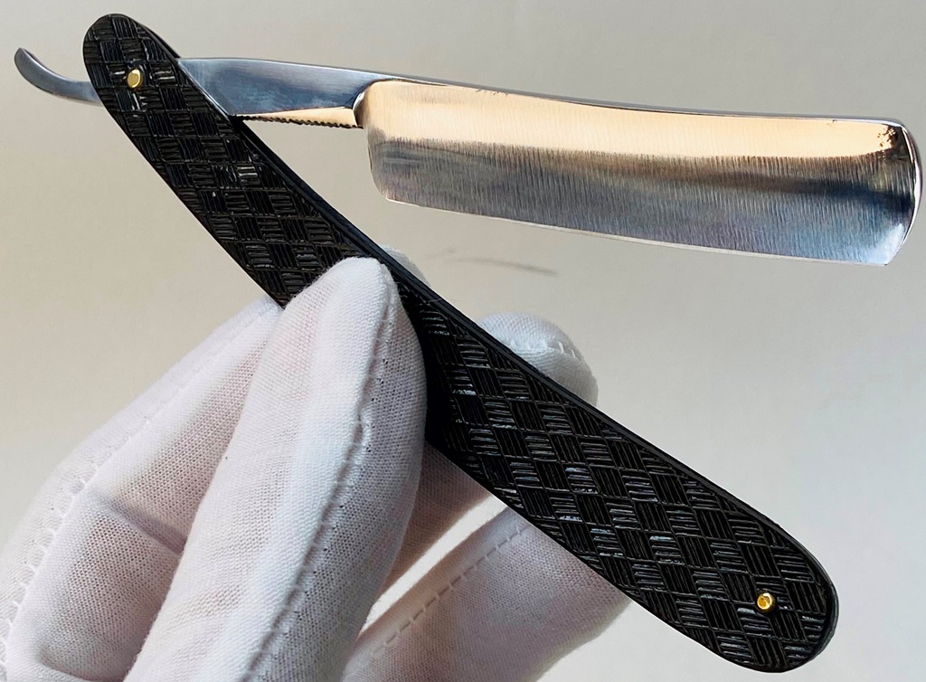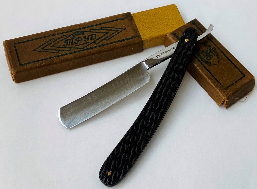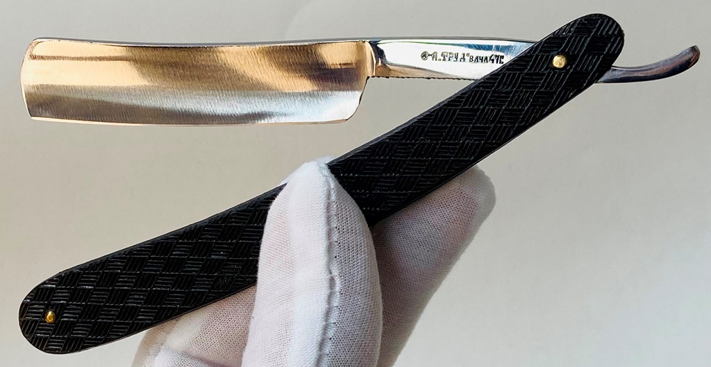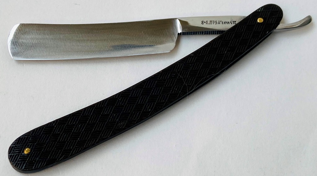 Ширина полотна-21.5 мм. Толщина обушка-5.9 мм. Полная вогнутость. Высококачественная углеродистая сталь. Середина прошлого века производство. Бритва в очень хорошем состоянии,без следов пользования.Не разбиралась! Немного освежи на самых тонких абразивах полотно,чтобы удалить микроцарапинки и придать металлу былой блеск. Умеренная полировка.Гравировка чёткая,без потертостей.Удобные пластиковые накладки дают возможность не так пристально следить за текущим уходом бритвы после бритья и не получить налёт ржавчины в районе осевого пина и эрля.Идеальная геометрия полотна:кромочка равномерна по всей длине и еле заметна. "Звонкая и поящая" сталь также способна выдавать качественный финиш при тонкой доводке на камнях,а также комфортное и чистое бритьё. Бритва подойдёт как новичку,в качестве стартовой,но также любому пользователю. Цена-15500 р с доставкой. Внимание! Важная информация! Spoiler Show
