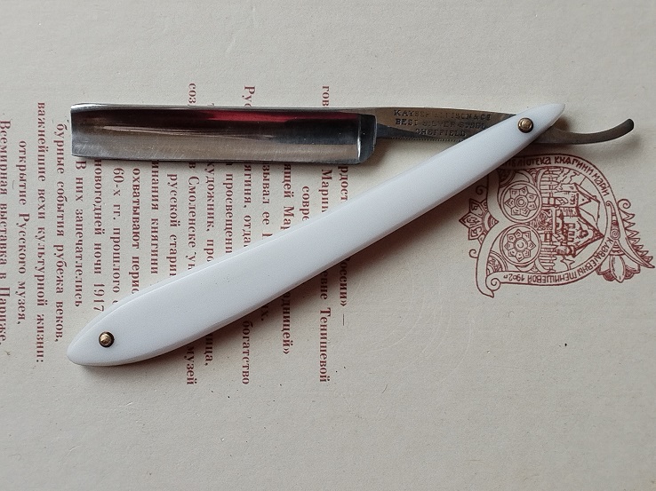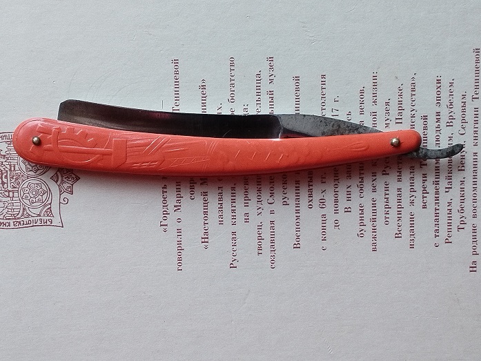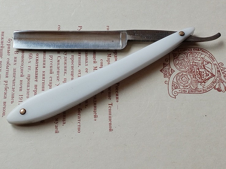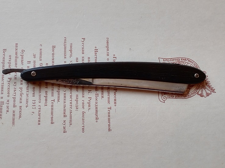 Редкое клеймо аэроплан. Ширина лезвия 19мм. Толщина обуха 5,2мм. Ручка из бука. Заточена и подготовлена для бритья. Цена - 7000 руб.