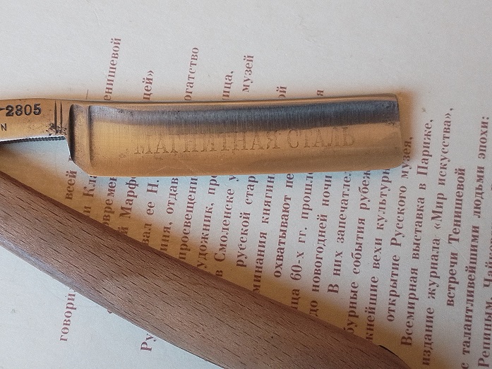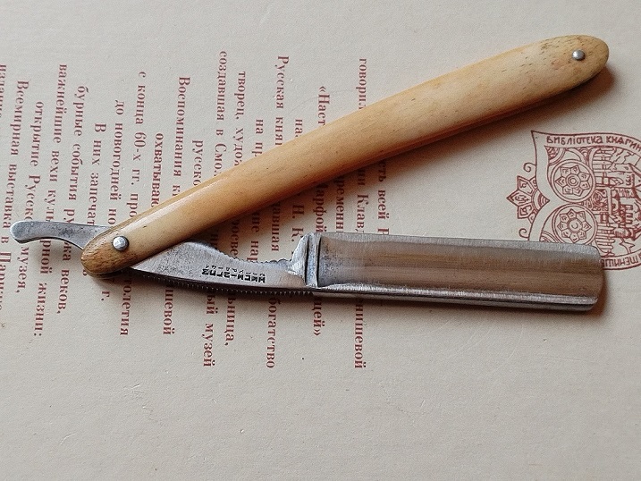 Редкое клеймо аэроплан. Ширина лезвия 19мм. Толщина обуха 5,2мм. Ручка из бука. Заточена и подготовлена для бритья. Цена - 7000 руб.