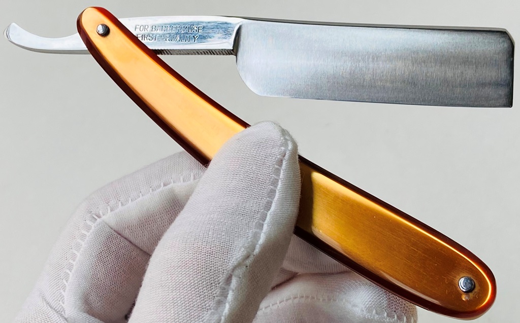 Бритва в пользовании не была,но требовала косметических работ.Минимальная шлифовка и полировка клинка. Геометрия на уровне.Новые втулки, с добавлением внутренних шайб.Родная ручка имеет "рисунок" желтоватого оттенка,по всей видимости заводского происхождения.Заточена и готова к бритью.