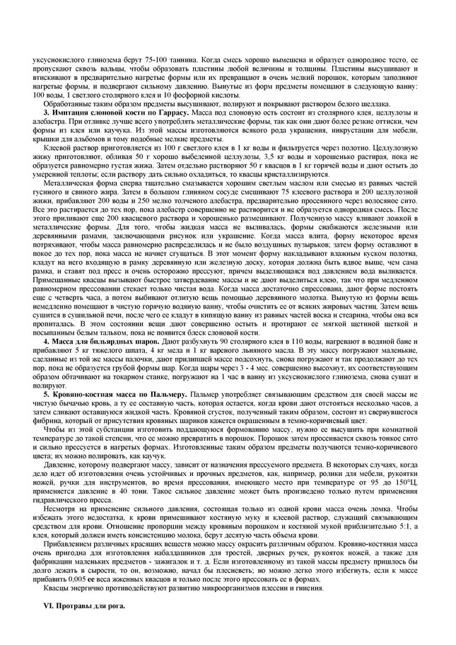 Печать по книге "Производственная техно-химическая рецептура", Москва 1931г. . КОСТЬ и РОГ. I. Беление кости. 1. Беление кости. Чтобы сообщить пожелтевшей слоновой кости первоначальную белезину, практикуют один из следующих способов: а) Слоновая кость слегка покрывается тонким слоем скипидара и выставляется дня на 3 или 4 на солнце, б) Взбалтыванием перекиси водорода с эфиром или бензином приготовляют эфирный раствор перекиси водорода. Отделяют через делительную воронку и обрабатывают этим раствором перекиси водорода, содержащим приблизит. 50 (по объему) кислорода, кость или рог. Этим способом одновременно растворяется жир и подвергается белению кость. Однако этот способ очень дорогой, в) Сначала кости обезжиривают обработкой эфиром или бензином и затем кладут в водный раствор фтористой кислоты, содержащей 1 % безводной кислоты, г) Обработанные предварительно бензином или эфиром кости кладутся в теплое место; когда последние следы жирорастворителя исчезли, кладут кости в смесь равных объемов перекиси водорода и воды и держат в ней до тех пор, пока они не выбелятся. Затем их моют в чистой воде и сушат, д) Слоновую кость погружают на некоторое время в перекись водорода, после чего ее насухо вытирают. Чтобы ускорить процесс беления кости подвергают ее действию лучей синей кварцевой электрической лампочки (что употребляется для лечебных целей). 2. Отбелка пожелтевших клавишей музыкальных инструментов. а) Клавиши обмывают раствором соды и затем покрывают растертой с водой в кашицеобразную массу хлорной (белильной) известью, которая должна оставаться на клавишах в течение 8- 12 час. Затем клавиши вытирают мягкой тряпкой. Необходимо тщательно избегать соприкосновения с металлическими частями. б) Клавиши непрерывно смачиваются водой, помещают под стеклянный колпак и подвергают в течение нескольких дней действию солнечных лучей. в) Клавиши кладут в смесь из 1 скипидара и 3 спирта и подвергают действию солнечных лучей. Все эти способы отбелки применимы вообще для пожелтевших изделий из слоновой кости. II. Протравы для кости. Анилиновые протравы для кости. Травление кости анилиновыми красками проще, чем другими способами, так как оно ведется в холодной ванне, чем устраняется возможность растрескивания предметов. Травление производится следующим образом: предметы кладут в таз и наливают столько воды, чтобы они были совершенно покрыты ею. Затем к жидкости прибавляют 2 чайные ложки уксуса и около 1 г краски, причем все равно -растворима ли последняя в спирту или в воде. Для нужных оттенков выбирают подходящие анилиновые краски или составляют их из нескольких. Костяные предметы оставляют в жидкости на 4 - 8 час. и вынимают тотчас же по достижении желаемой густоты тона. Затем их обмывают водой, высушивают и полируют венской известью с мылом. Спиртовые лаки и политуры здесь нельзя употреблять, так как они могут растворить краску на поверхности кости. Если нужно окрасить бильярдный шар из слоновой кости в два цвета, параллельными полосами, то его уже отшлифованным зажимают между тремя тонкими палочками, вставленными вертикально в небольшую дощечку, покрывают среднюю полосу масляным лаком и окрашивают сперва один сегмент, погружая им шар вместе с дощечкой в соответствующую анилиновую протраву. Окончив окраску, дают ей просохнуть, а лак счищают ск