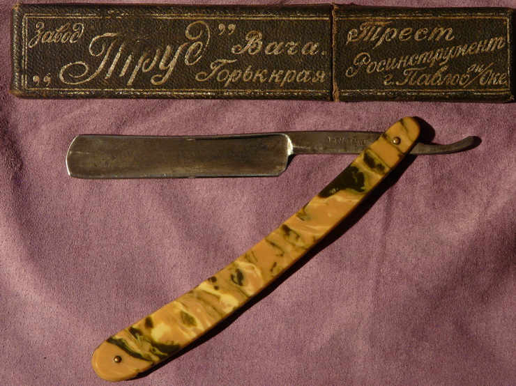 Вот моя бритва "Труд". Судя по надписи на коробке выпуска 30-х годов. Название Горьккрай [Горьковский край] существовало с 7 октября 1932 года по 5 декабря 1936 года.