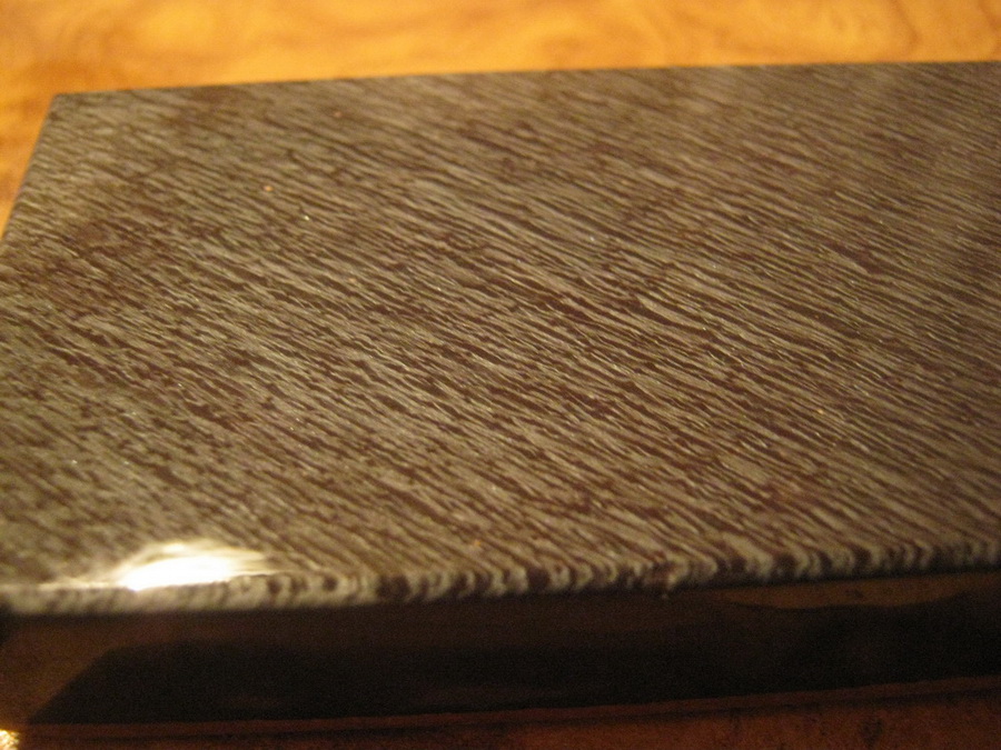Re: Что за камень?Приобрёл в воскресенье точильный брусок.Размер 177*40*18.Был засален.Дома прошелся по нему абразивом с водой и проявился красивый волокнистый рисунок.Волокна рисунка идут по диагонали на обоих слоях в одном направлении.По всему выходит Бельгиец?Желтый слой толщиной миллиметров 4-5.брусок цельный,стык желтого слоя с синим неровный,микроволнами.Камень почти не сточен,только сколы по краям,небольшой свал к краю.Желтый слой почти равной толщины по всему бруску.Износ с обоих сторон.Как определить односторонний он или двухсторонний?Отдал кстати аж один доллар
