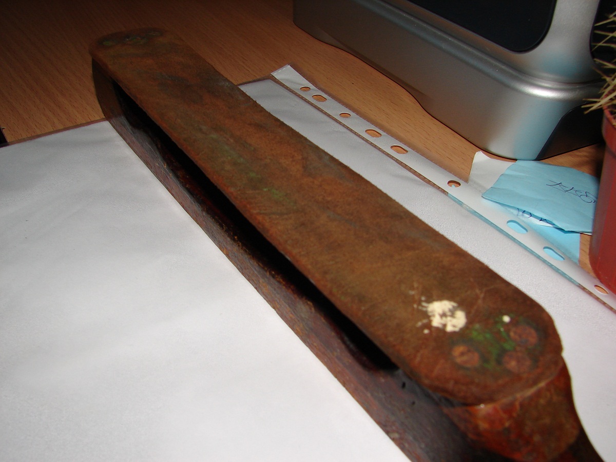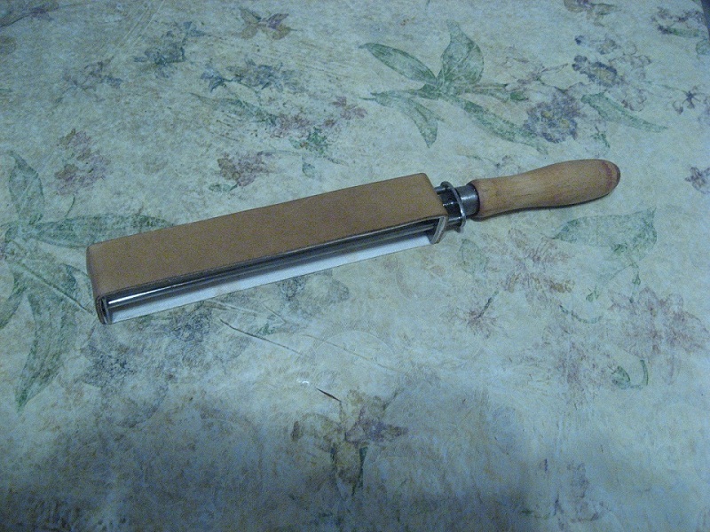 Re: Изготовление ремней для правкиВот отреставрировал старенький ремешок (кстати может кто подскажет что это? клейм нету...). Пришлось отдирать ручку капитально, да и кожу менять на новую.