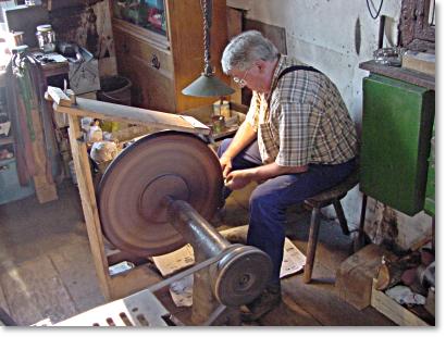 Работа в шлифовальне в Haan не стояла на месте и с течением времени появились новые способы обработки металла. Шлифовка вогнутостей Hohlschleifen (как я понял), полировка вогнутостей (см. фото внизу) Pliesten* и полировка бритв была доведена до особого мастерства и высшего качества, в особенности в семьях Ern и Linder.